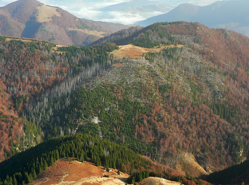 V úvodnom stúpaní od vodopádu cez les a Mojžišove pramene je len pár oddychových úsekov, ale traverz popod hrebeň smerom na chatu pod Chlebom je pohodový. Len na niektorých miestach je dosť poničený lavínami a zosuvmi. To isté platí aj o žltej odbočke, ktorá z neho vedie na hrebeň (do sedla Za Hromovým). Tu už trávnatý svah veľmi trpí eróziou, chcelo by to presmerovať alebo spevniť chodník. Zo sedla Za Hromovým do Stohového sedla je to ďalšia asi hodina a pol prevažne z kopca, s krásnymi výhľadmi do Vrátnej aj do Turca. V tomto počasí tu bolo samozrejme plno ľudí. My sme nechápavo pozerali na obrovské holoruby priamo pod Veľkým Rozsutcom, hnusný zásek novej cesty na Grúni a nejaký nový hotel pod Sokolím, ktorý svojou výraznou žltou farbou ohromne „ladil“ s okolím. Biznis forever! Na druhej strane hrebeňa (pod Žobrákom) sa zas v lese vyzúrili lavíny, vietor aj lykožrút. Každý nech si domyslí, čo do prírody národného parku patrí viac.Stúpanie na Stoh bolo tradične nekonečné a šmykľavé, odmenou za námahu bol „pózujúci“ Rozsutec. Klesanie do Kraľovian je najprv po príjemnom chodníku nad hranicou lesa s peknými výhľadmi hlavne na protiľahlé svahy nad záverom Šútovskej doliny. Nižšie v lese už značka vedie po zvážnici, ktorá je hlavne v spodnej časti riadne povymieľaná. Dobrá ústupová trasa z hrebeňa, ale opačným smerom odporúčam len masochistom.