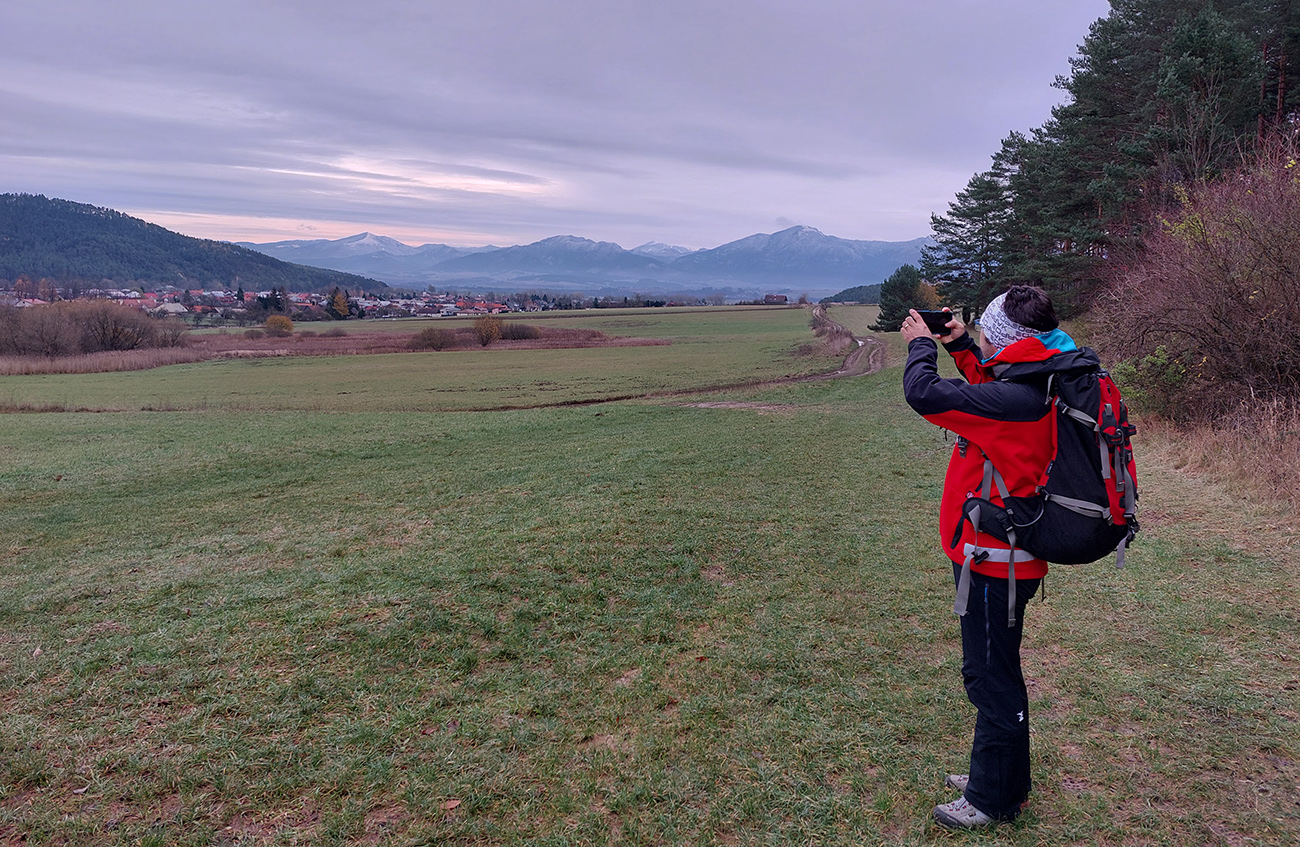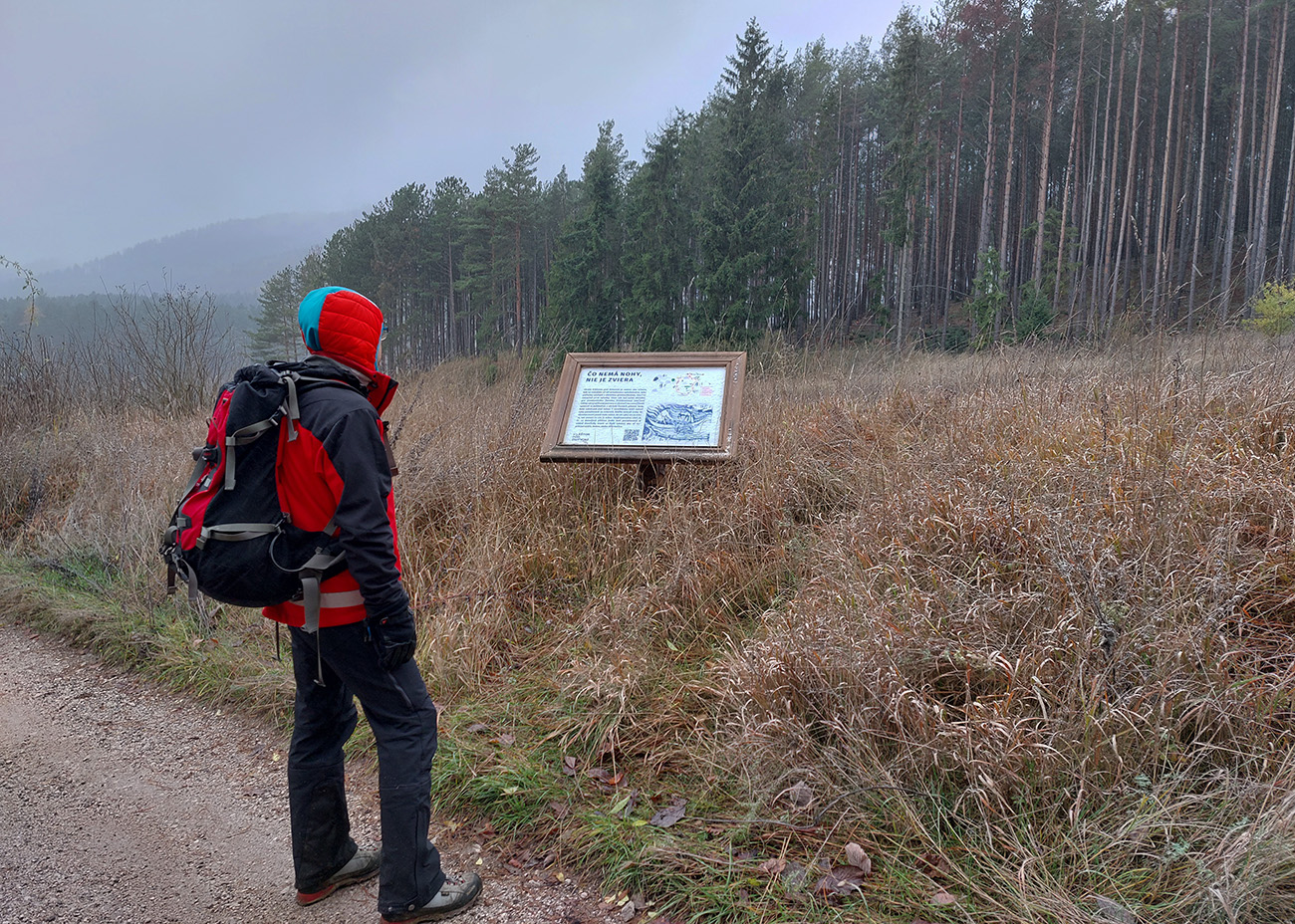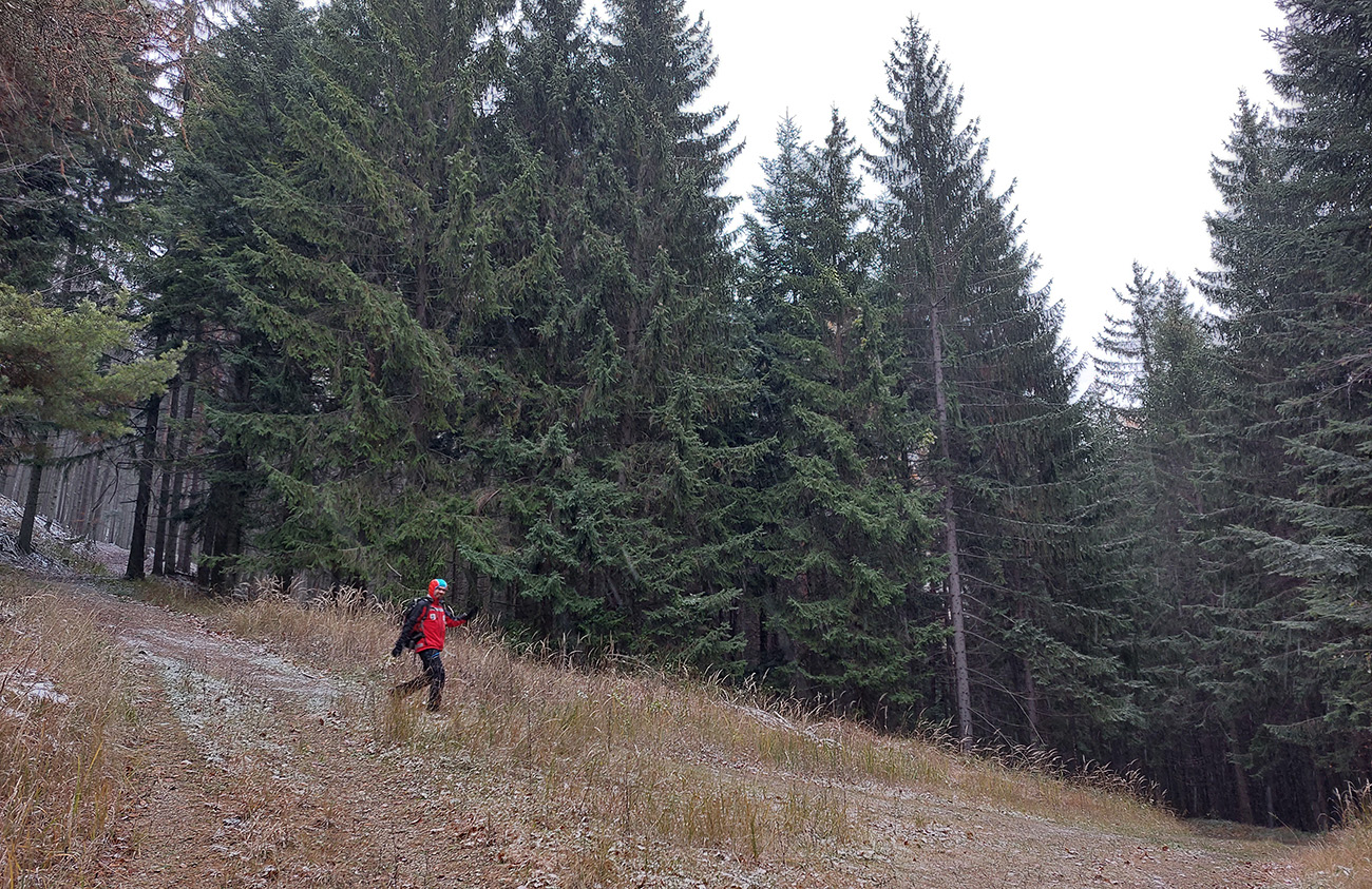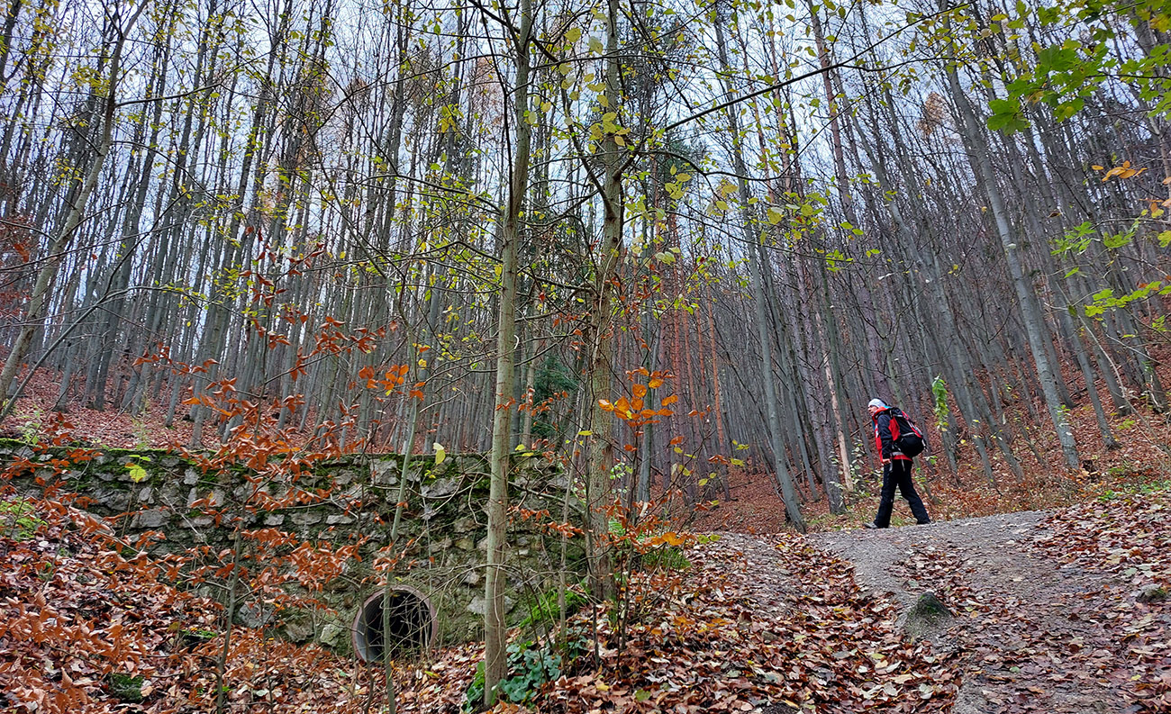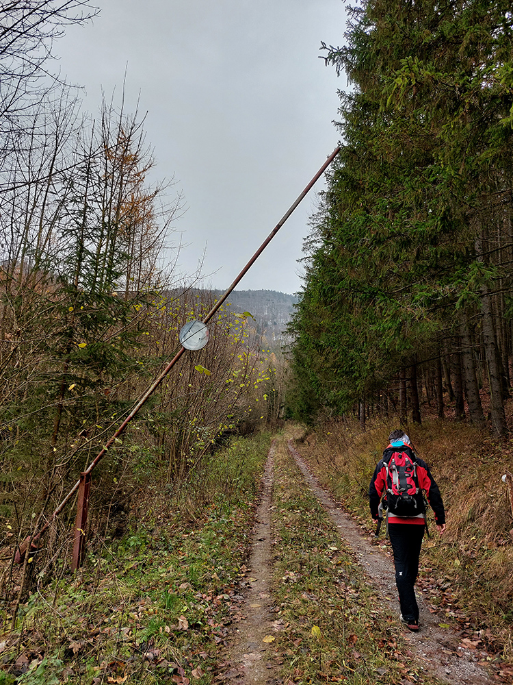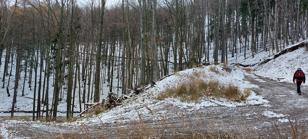 Takže úvod popod kalváriu, strmšie po tej zelenej a potom mierne z kopca na horný okraj veľkých, podhorských lúk. Tam sme ocenili posledné výhľady cez kotlinu na východ (aj keď už poriadne šedivé), a ponorili sme sa definitívne do lesov. Tipoval som, aké zvery uvidíme, ale ani stopy! A to sa tu furt voľačo motá, a teraz už bolo dnu do lesa vidieť pekne do diaľky, čo bolo v ňom viac svetla, keď listy opadli. Ale tak aspoň príjemné ticho bolo a skoro bezvetrie, nejaká tá lesnícka infraštruktúra všade naokolo a v pohode vykecávačka až po odbočku.