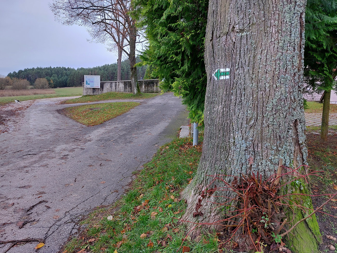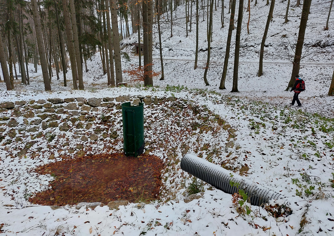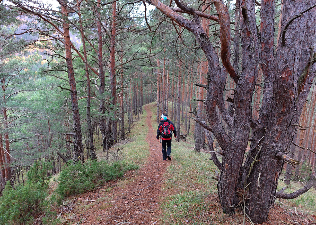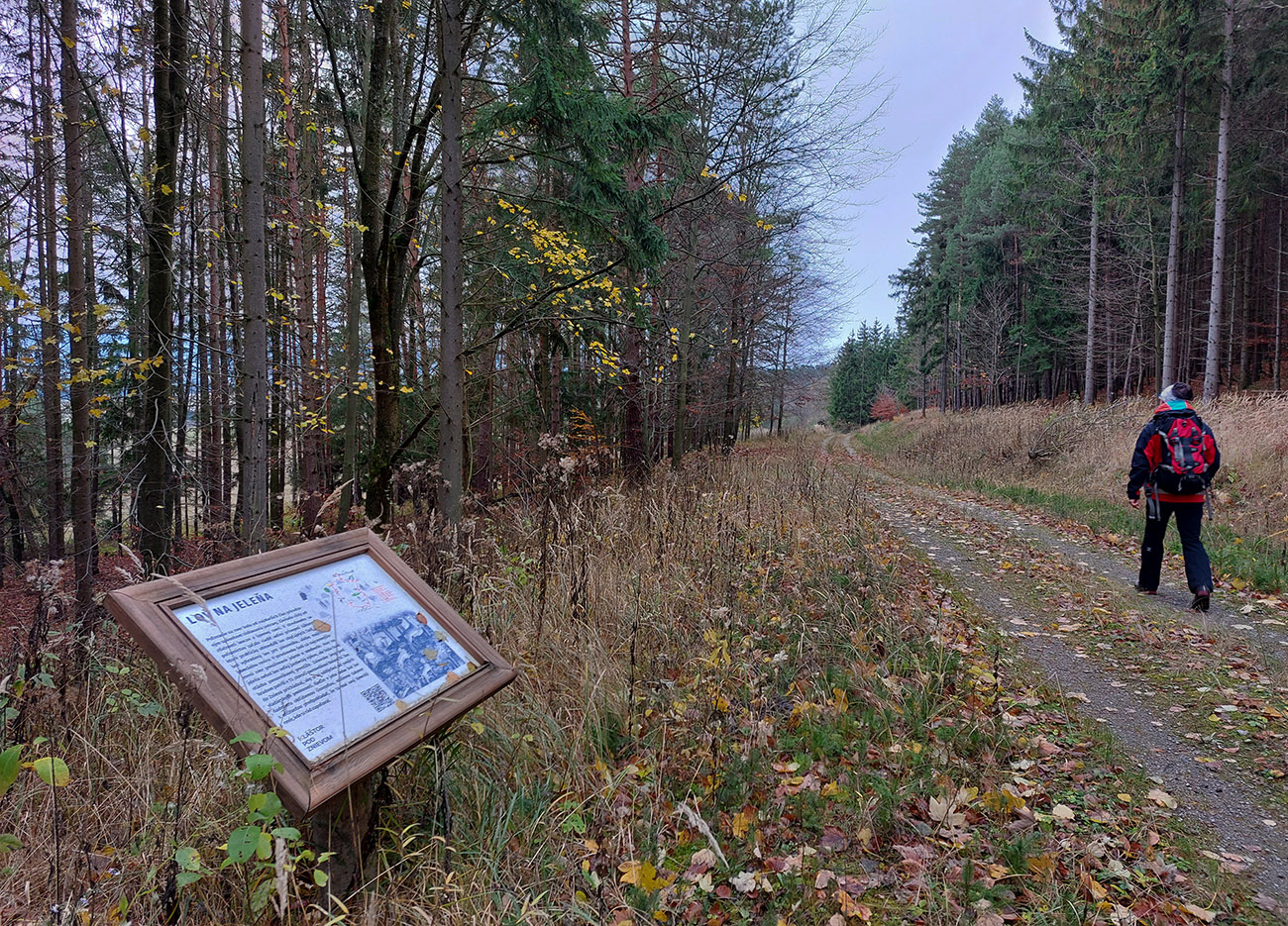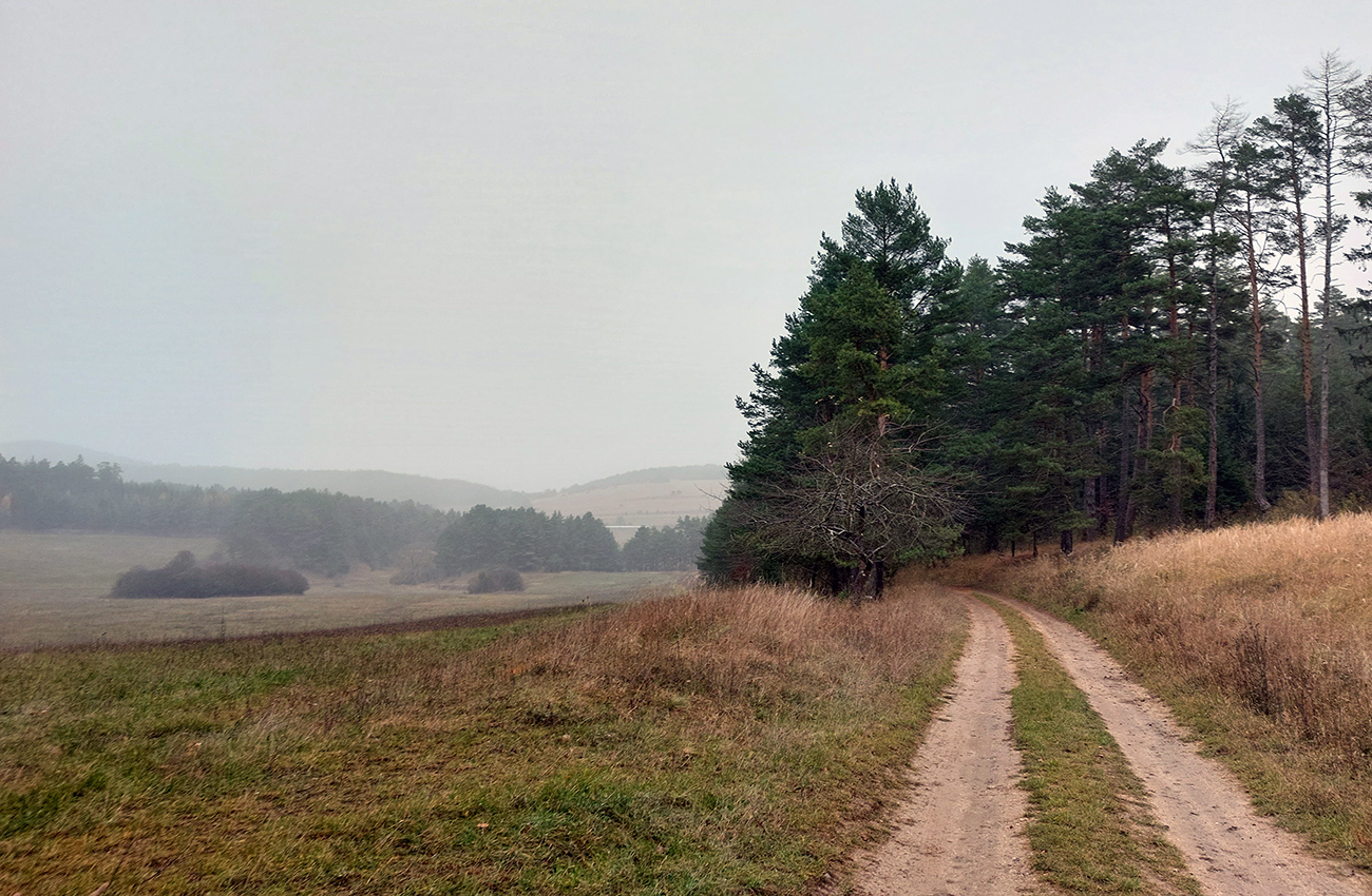 Takže úvod popod kalváriu, strmšie po tej zelenej a potom mierne z kopca na horný okraj veľkých, podhorských lúk. Tam sme ocenili posledné výhľady cez kotlinu na východ (aj keď už poriadne šedivé), a ponorili sme sa definitívne do lesov. Tipoval som, aké zvery uvidíme, ale ani stopy! A to sa tu furt voľačo motá, a teraz už bolo dnu do lesa vidieť pekne do diaľky, čo bolo v ňom viac svetla, keď listy opadli. Ale tak aspoň príjemné ticho bolo a skoro bezvetrie, nejaká tá lesnícka infraštruktúra všade naokolo a v pohode vykecávačka až po odbočku.