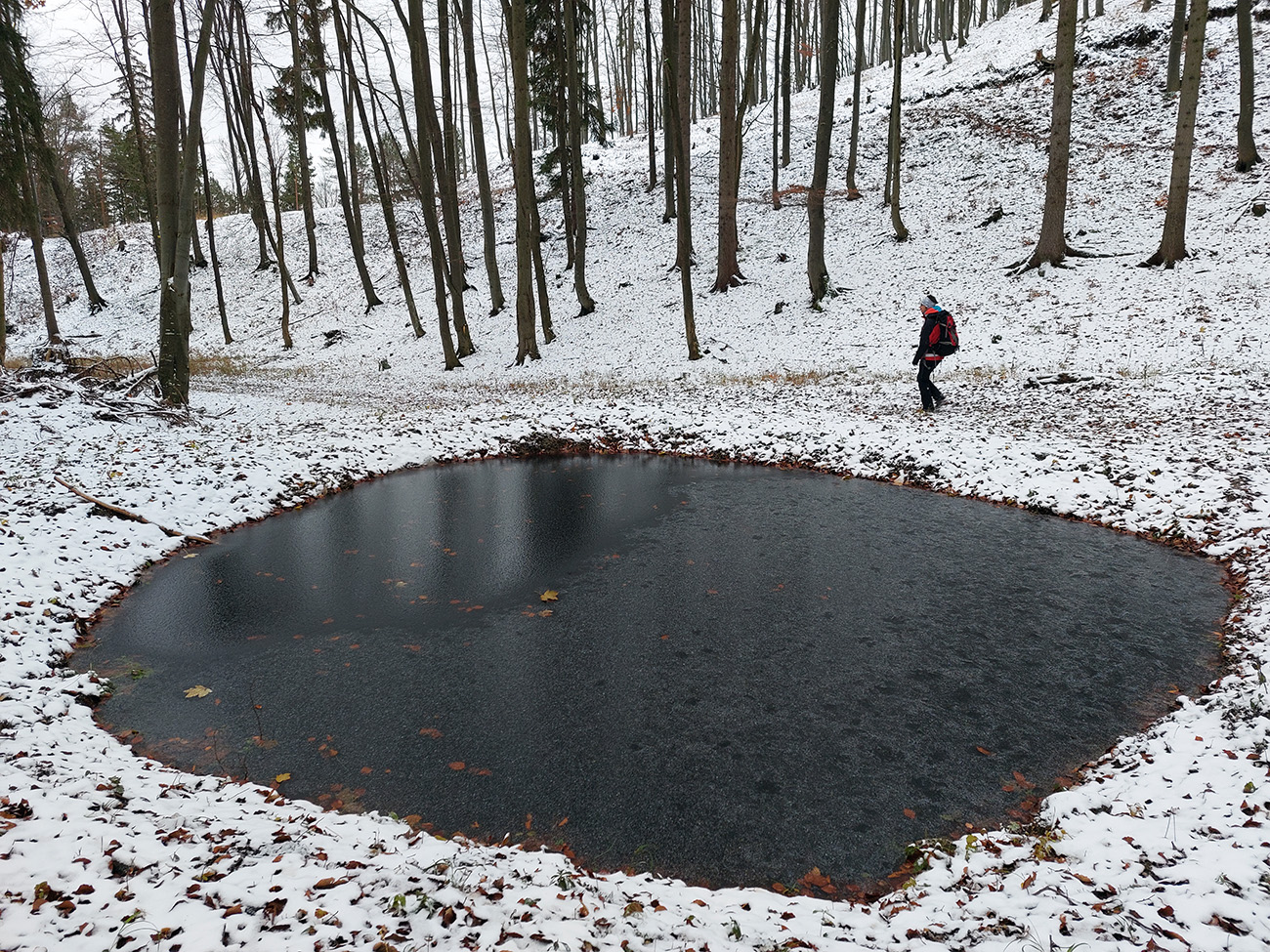 Potom už strmo dole, až von z lesa, po širokej ceste. Tam dole rampa, stavebné stroje, aj nejaká lesohospodárska firma či čo, trochu asfaltu a odbočka doľava, po cyklotrase podhorím nazad do Kláštora. Striedanie lesov a lúk, nechutne zubatý plot okolo najstaršieho rybníka v Turci (Vädžer v 13. str. vybudovali premonštráti), približovanie sivej snehovej steny od severu a na začiatok/do cieľa sme dorazili po pohodových necelých štyroch hodinách, s prvým hustejším snežením. Akurát to vyšlo!