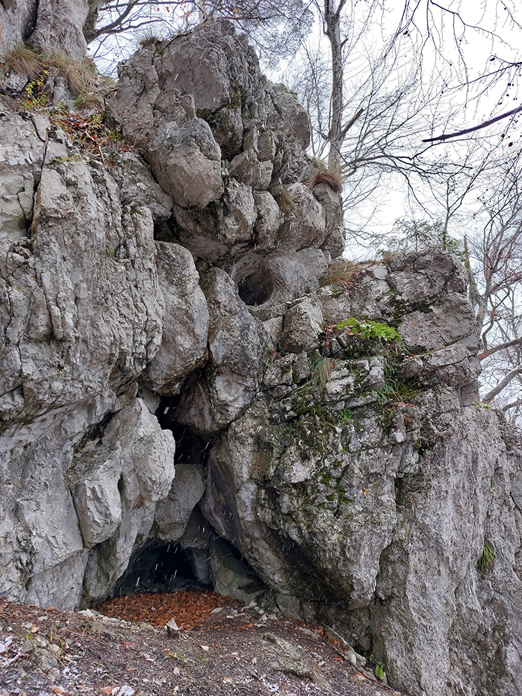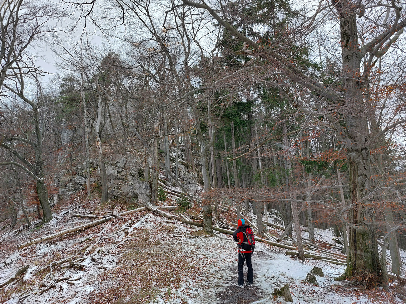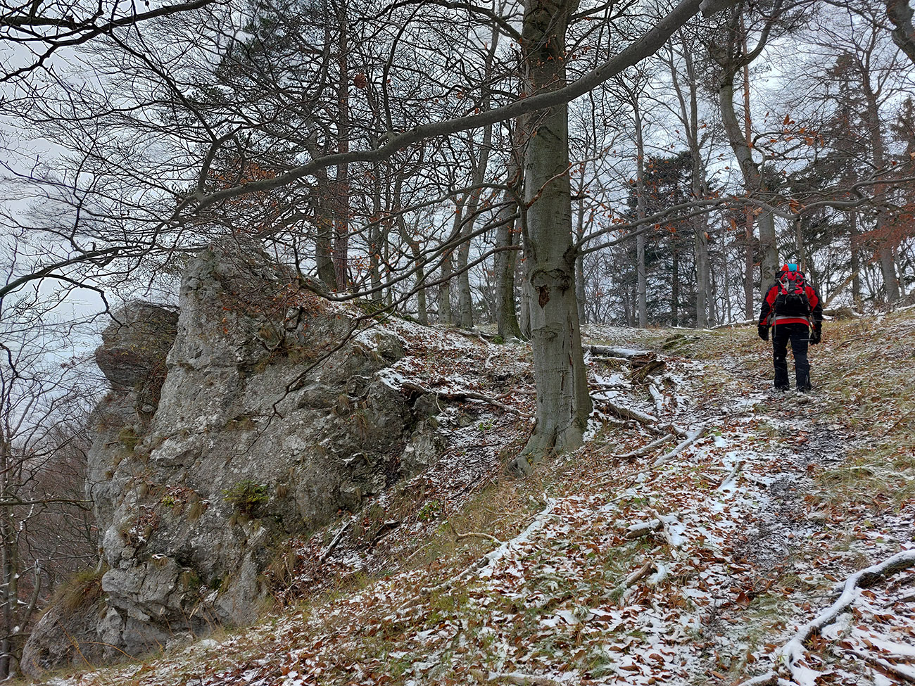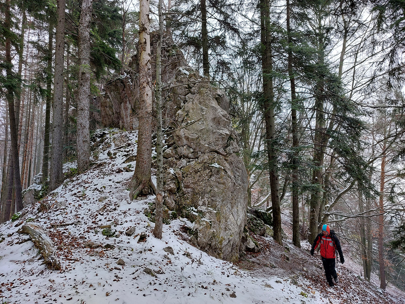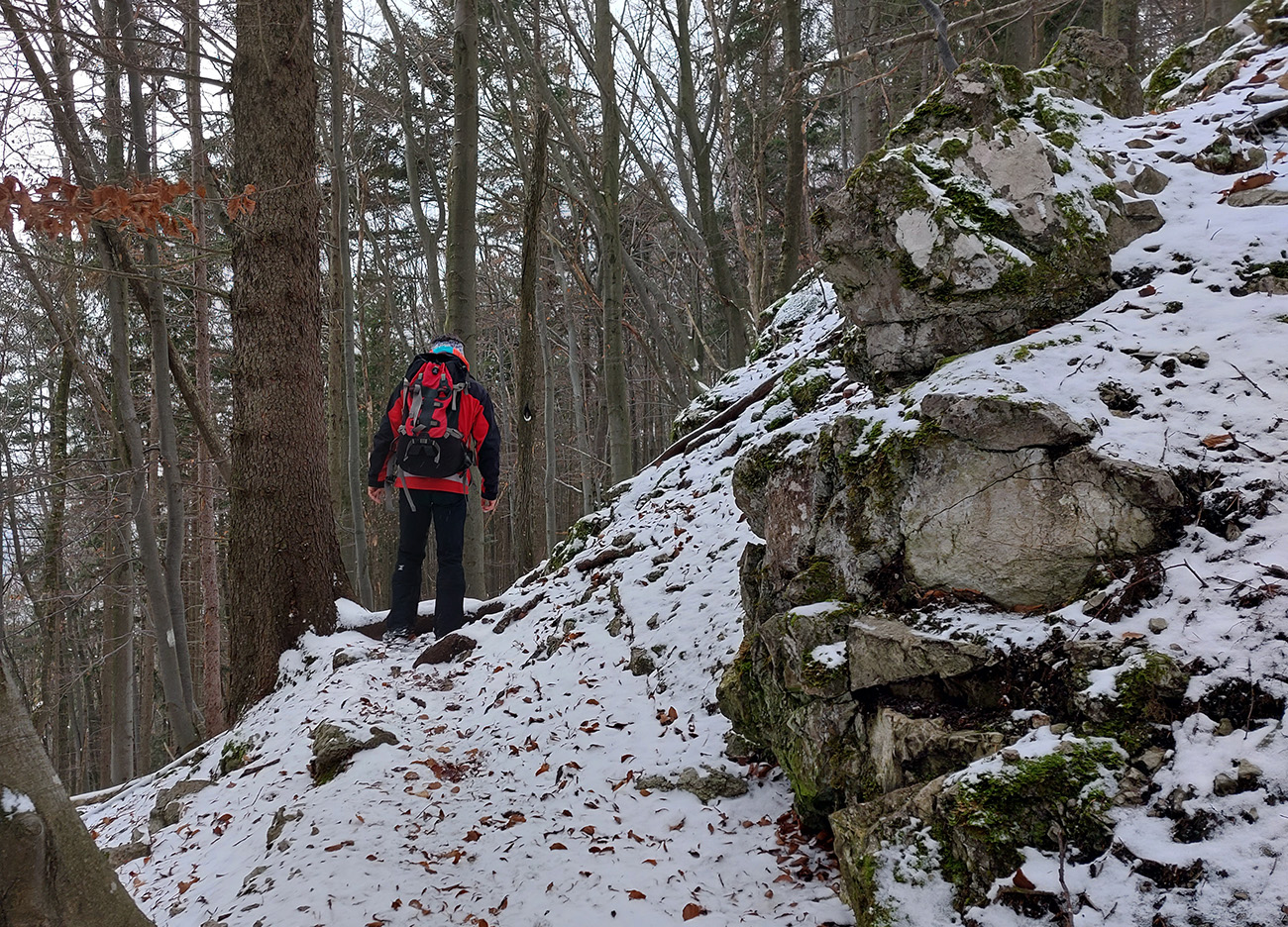 Na vyhliadku z Ondrašovskej skaly vedie dobre značená odbočka z lesnej cesty – úzky, hrboľatý chodníček v traverze popod ostatné skaly. Stále vidno bielo-zelené značky poľovníckeho náučného chodníka, ktorý vznikol vraj v r. 2002. Či sú jágri ešte stále nadšení, keď sa im medzi hradom a skalou motajú turisti po revíroch, to netuším, ale návod je v tom staršom článku , keby niekto chcel. Vyhliadka? Hrebeň Veľkej Fatry už zmizol v snehových prehánkach a prefukovalo tam jedovato, tak davaj preč. Ale po opačnej skale brál, aj po ich temenách čiastočne. Pekná jelenia prť, ani nie chodník, a pekné skalné útvary aj okienka cestou do sedielka pod cestou, po ktorej sme prišli.