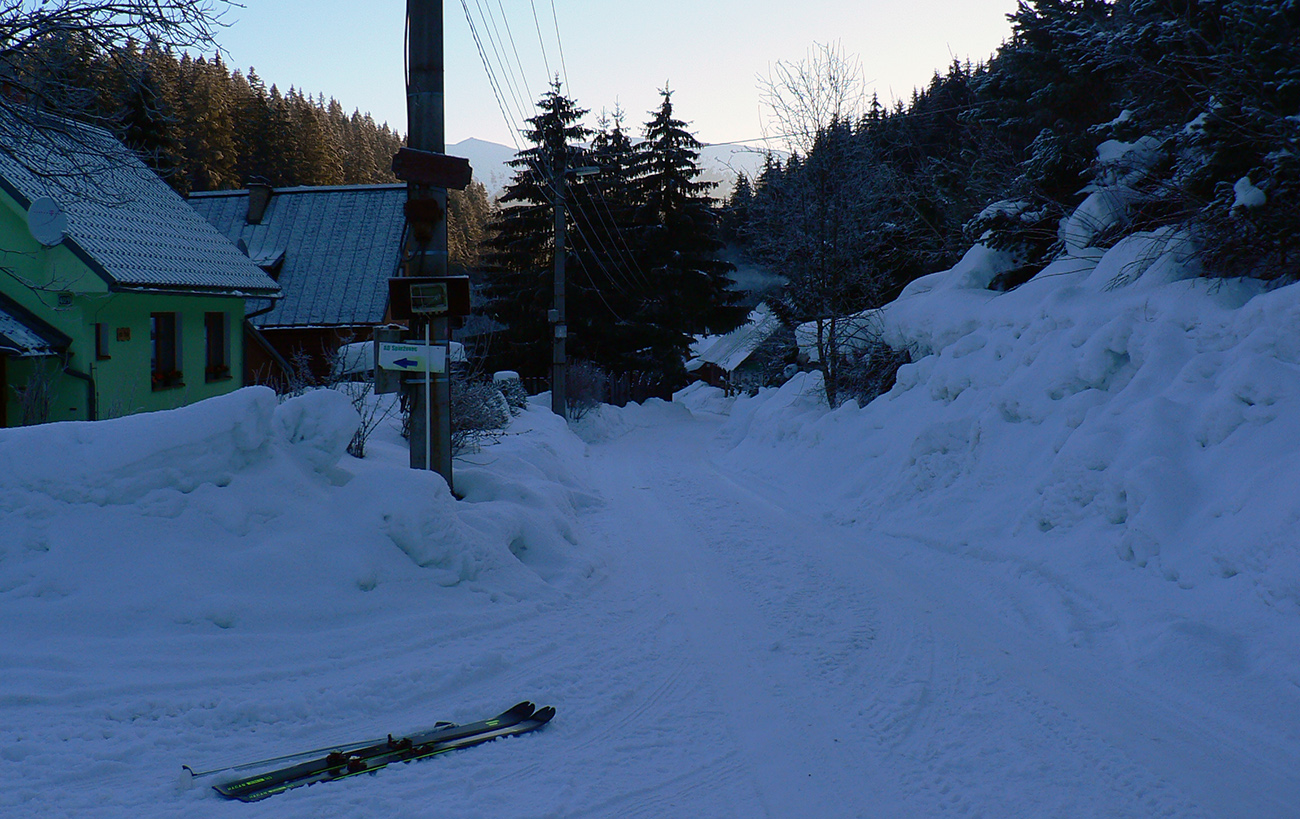 No a záver – už len do Lúžnej sa doplaziť voľajako... Tak ešte traverz popod Veľkú Chochuľu a Košarisko, krížom cez ďalšie oblúkmi pokreslené muldy a svahy, ktoré síce lákali, ale času už nebolo. V sedle pod Košariskom pásy dole. Chvíľa rýchla po vytvrdenom hrebeni, potom tri chvíle bežkovania, palicovania a korčuľovania v snahe dostať sa bez pásov do sedla pod Skalkou. Skoro sa mi to podarilo, ale nového snehu v nižších polohách pribúdalo a vlhol. Tak ešte posledné naliepanie na krátkych pár minút mierne do kopca, aby som sa na žltú dostal, a potom už popri kríži a po rúbaniskách „rýchlo a zbesilo“ dole. Inak celkom dobré lyžovanie by to bolo – lebo tvrdo, ale nie ľadovo, v lesíku pod krížom aj prašanové záveje. Ale čas odchodu autobusu sa blížil a či dolyžujem až do dediny, to som netušil.