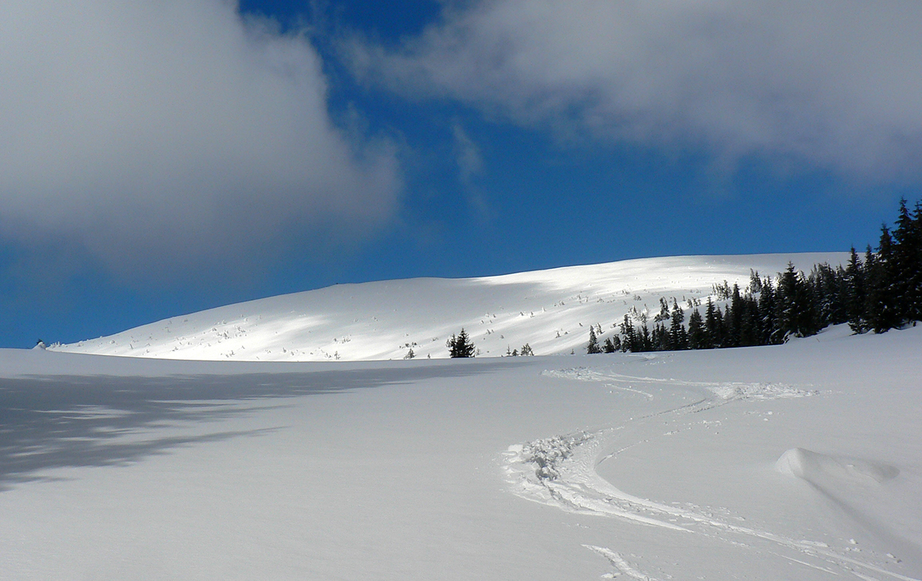 Potom nad lesom už paráda. Sneh akurát držal, ale nelepil, zo zadekovaných dolín aj dáke tie hmly vybehli na hrebeň, nebolo bárs horúco a viditeľnosť parádna. Tak som si „z výkladu“ ako prvé vybral juhovýchodné rebro Malej Chochule. Až dole po les úplná paráda. Kompaktný, rovný povrch, ani prašan, ani kašan, kôrka žiadna, len úplne dole už sneh trochu navlhnutý.