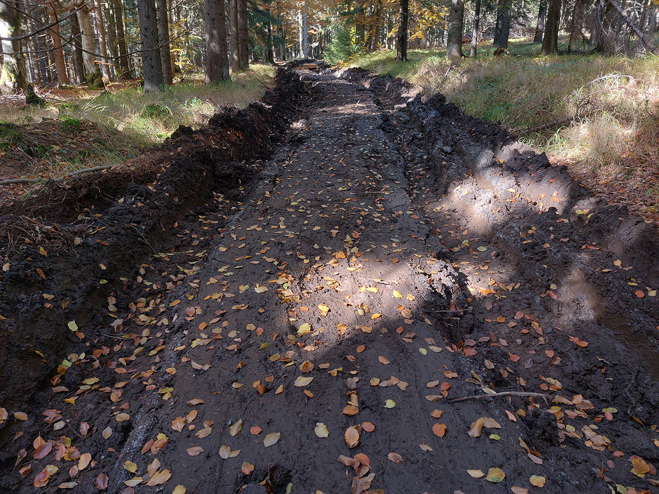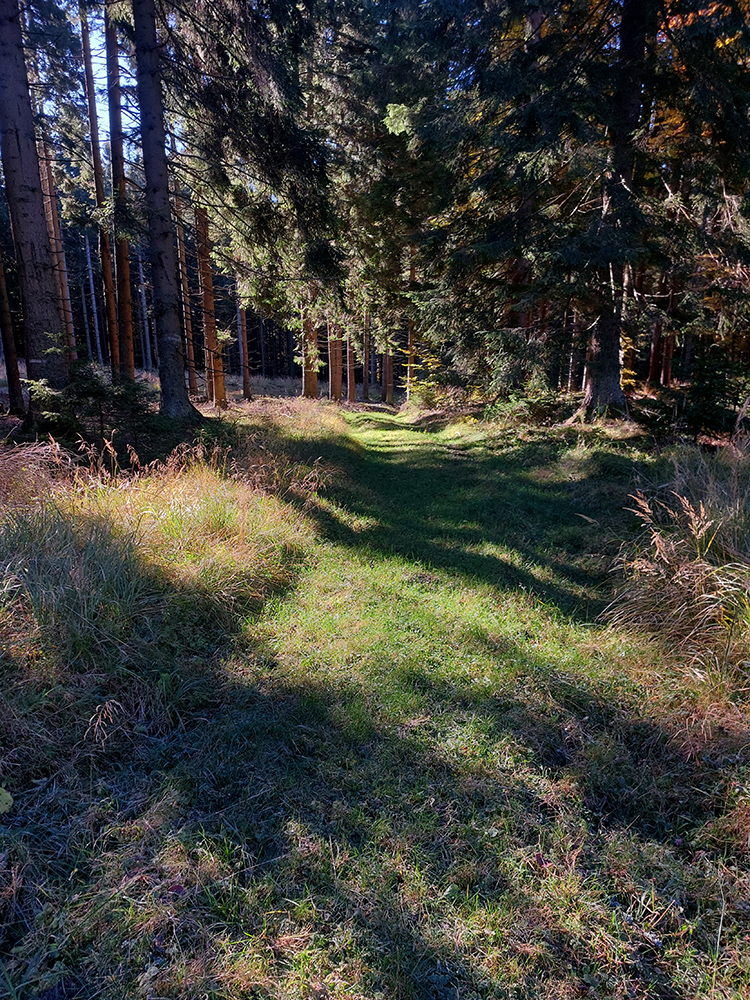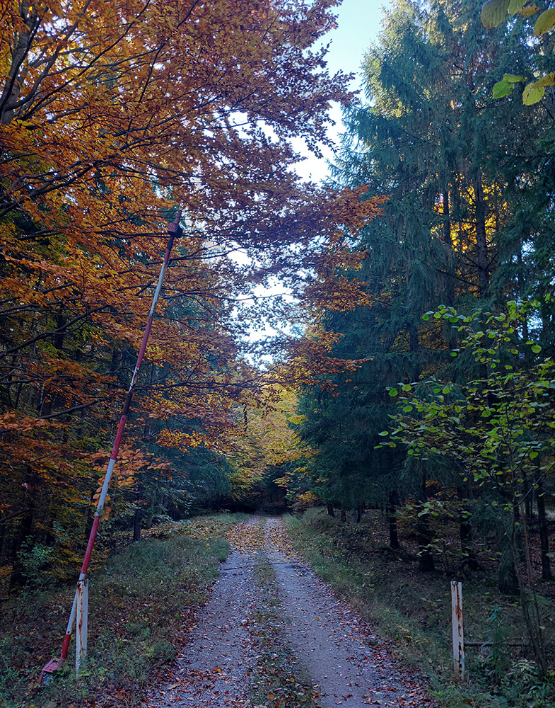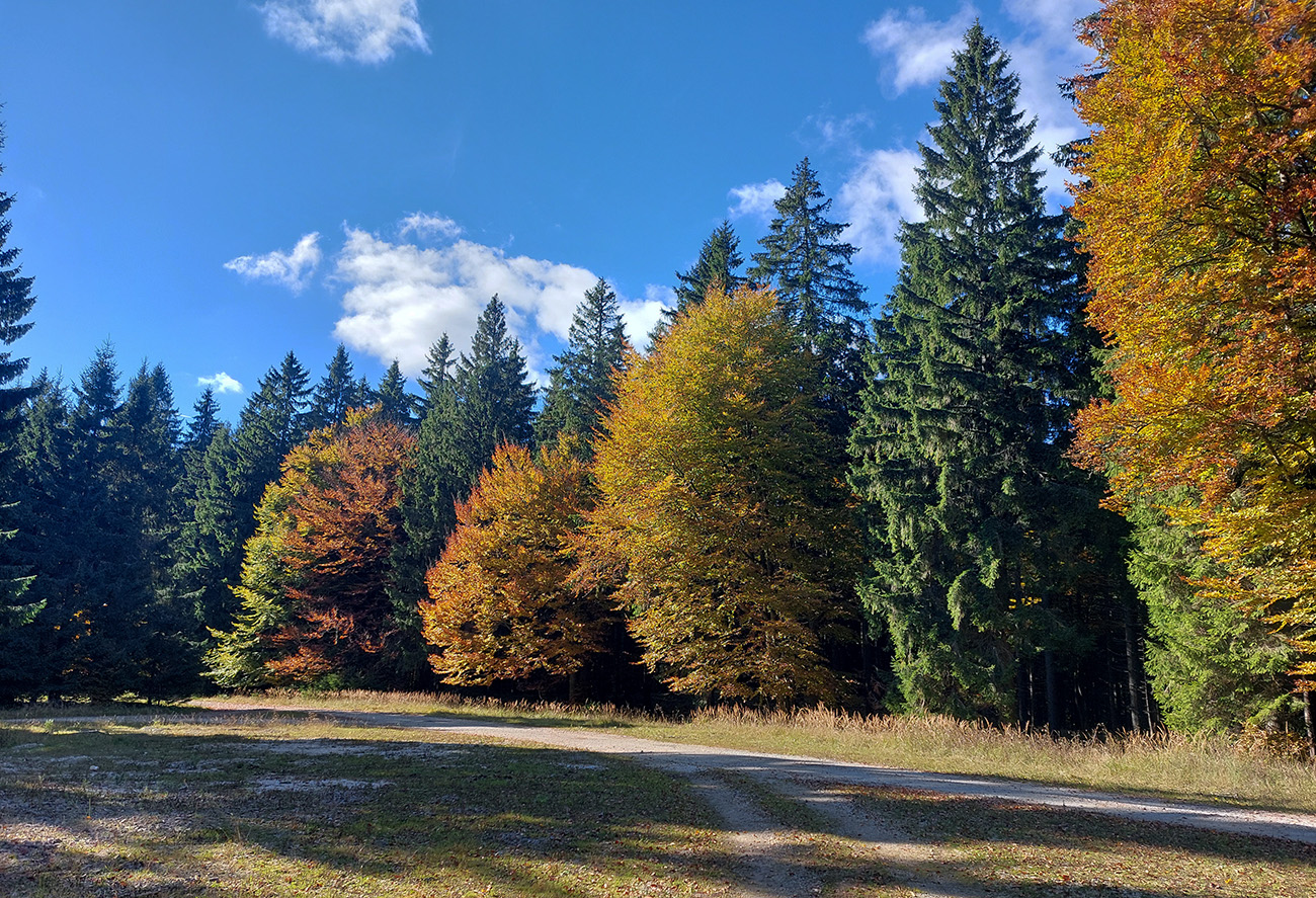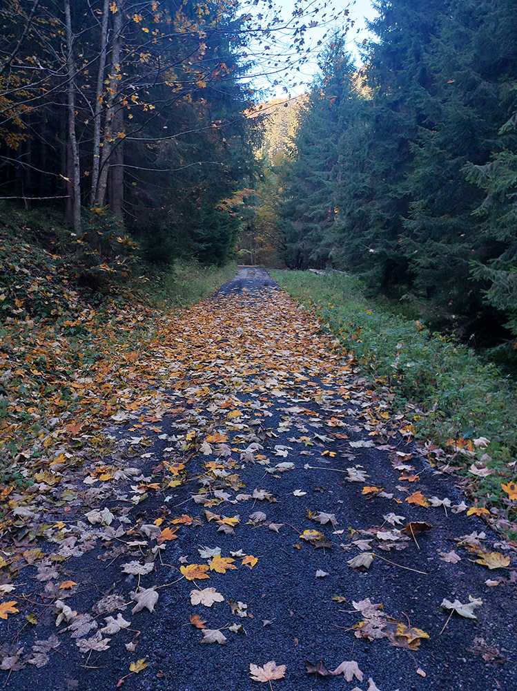 Prvá etapa od vlaku cez dedinu a popod lom do doliny Čiernej vody, ponad vodárenskú nádrž, popri chate Obrázok a Dirhabské sedlo až po zelenú značku pod sedlom Tunel bola ozaj výlučne po zvážniciach. Boli aj „strade bianche“, aj nejaký ten asfalt, aj mäkké, machom a ihličím vystlané cesty, všeeetko možné, ale všetky dobré, nerozrýpané, aj pre bajk. A farby dookola sýte, radosť behať/jazdiť.