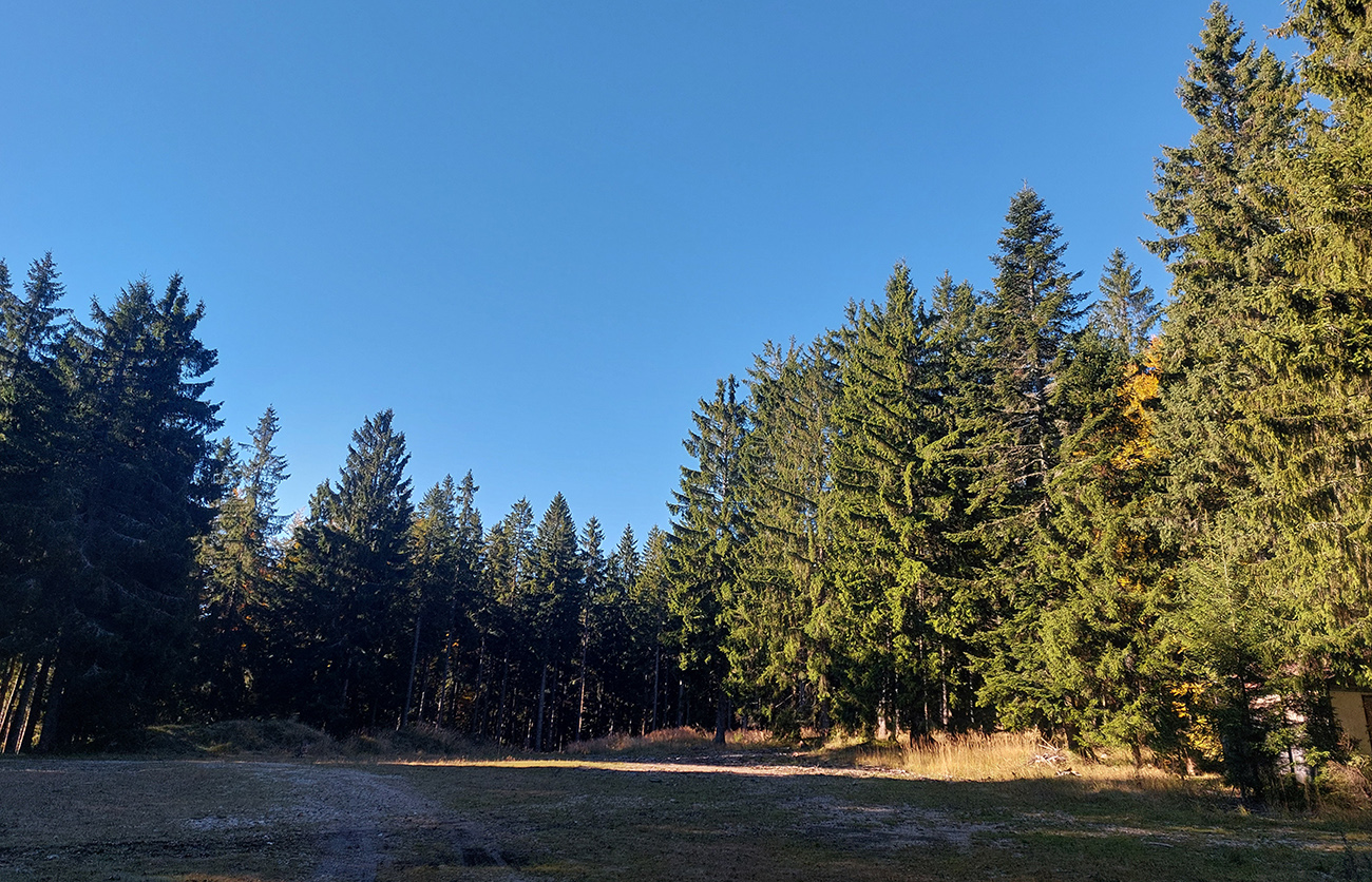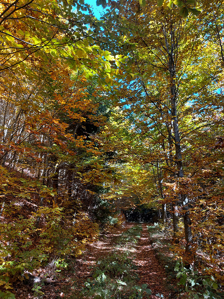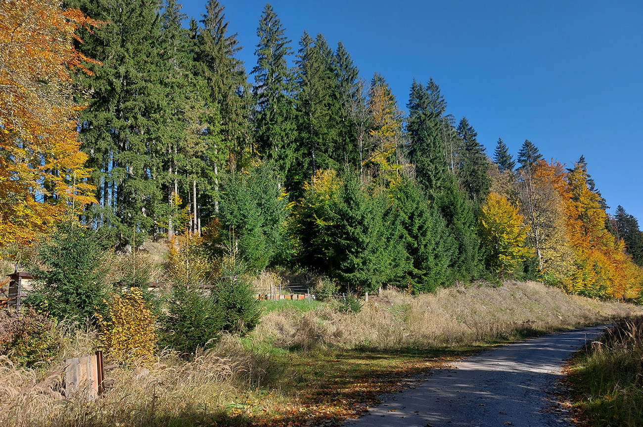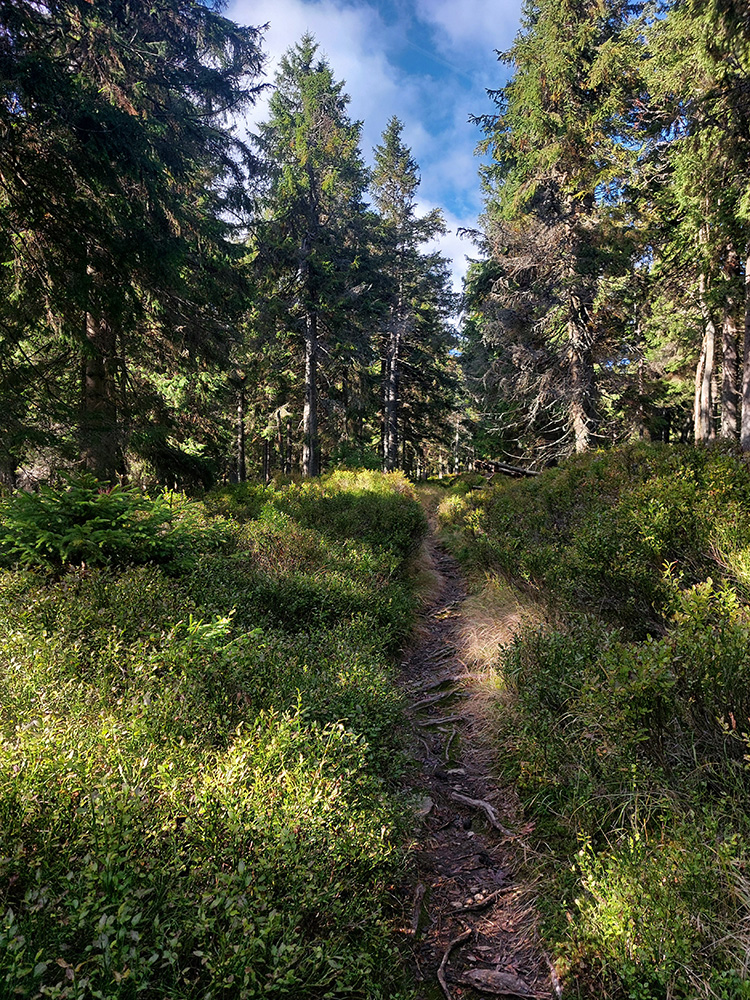 Prvá etapa od vlaku cez dedinu a popod lom do doliny Čiernej vody, ponad vodárenskú nádrž, popri chate Obrázok a Dirhabské sedlo až po zelenú značku pod sedlom Tunel bola ozaj výlučne po zvážniciach. Boli aj „strade bianche“, aj nejaký ten asfalt, aj mäkké, machom a ihličím vystlané cesty, všeeetko možné, ale všetky dobré, nerozrýpané, aj pre bajk. A farby dookola sýte, radosť behať/jazdiť.