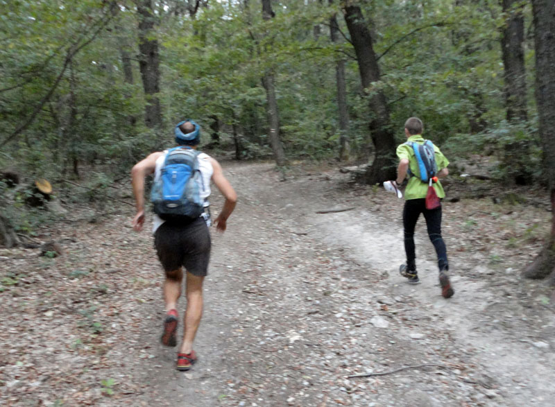 Druhá polovica trate bola väčšinou po lesoch bez výraznejších výhľadov, okolo Vtáčnika sa o kamene za tmy výborne potkýna. Ani tie rujné jelene tak nehulákali, ako keď si niekto nakopol palec. Trochu divná bola asfaltová vložka Penhýbel – Veľké Pole (K6) po hlavnej. Škoda že značka nejde vedľa, po lúčnej ceste. Dalo by sa. Stúpanie Veľké Pole - Rúbaný vrch je výživné a nekonečné a hneď na začiatku v dedine cesta ako do neba strmá. Tam (po 70. kilometri) sa už asi každý bil len za seba a kto sa dotrápil cez Vtáčnik až na Veľký Grič, na poslednú kontrolu, za odmenu ho čakal bonbónik v podobe „nádherného“ chodníka do doliny :-) Kto toto prežil, môže sa prihlásiť na maratón do amazónskeho pralesa. A keď sa pred ôsmou večer spustila prvá prehánka na tie klzké skaly a konáre a potom na hrebeň Vtáčnika sadla s tmou aj hmla, len vtedy to začalo byť zaujímavé a hore sa kufrovalo jedna radosť :-)
