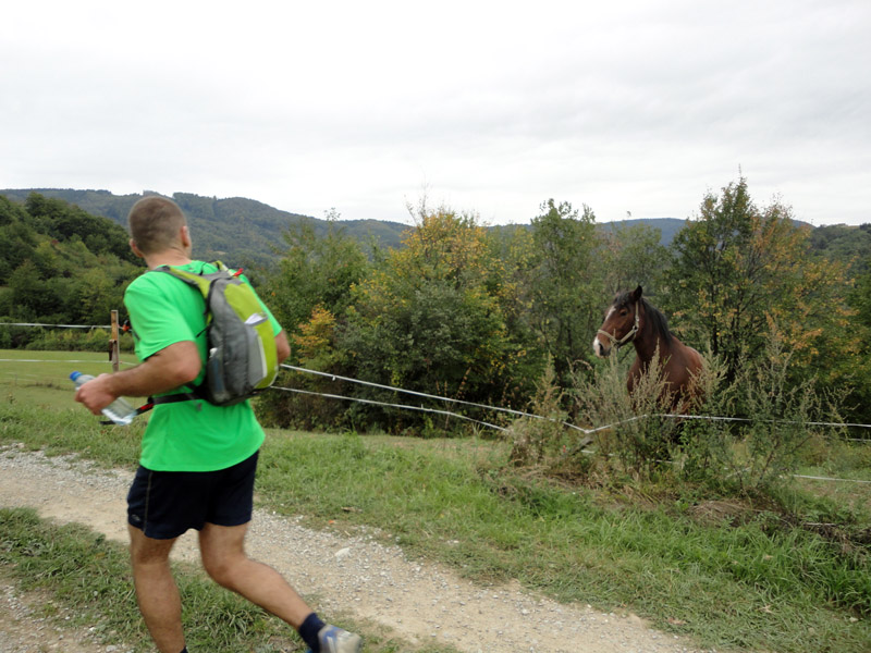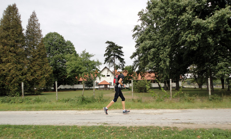 Prvá polovica trasy po Jedľové Kostoľany je krajinársky pestrejšia, aj bolo času sa poobzerať po koňoch, lúkach, hradoch a štáloch. Lebo väčšinou to bolo po hladkých poľných a lesných cestách, dosť bolo aj asfaltu (vraj 18km). Nebolo treba tak pod nohy kukať. Ale na cedule hej, lebo sa našiel aspoň jeden taký, čo nenašiel označenú kontrolu (K2) v Kostoľanoch pod Tríbečom :-) Ale vraj mu to prepáčia – čo už, keď je pena u huby, zapnuté nohy a vypnutý mozog. V ceste stáli tri výrazné kopce – Zobor na utvorenie hada, aby nebola zápcha na chodníku, Žibrica a Tríbeč. Ale väčšinou to bolo také mierne hore-dolu.