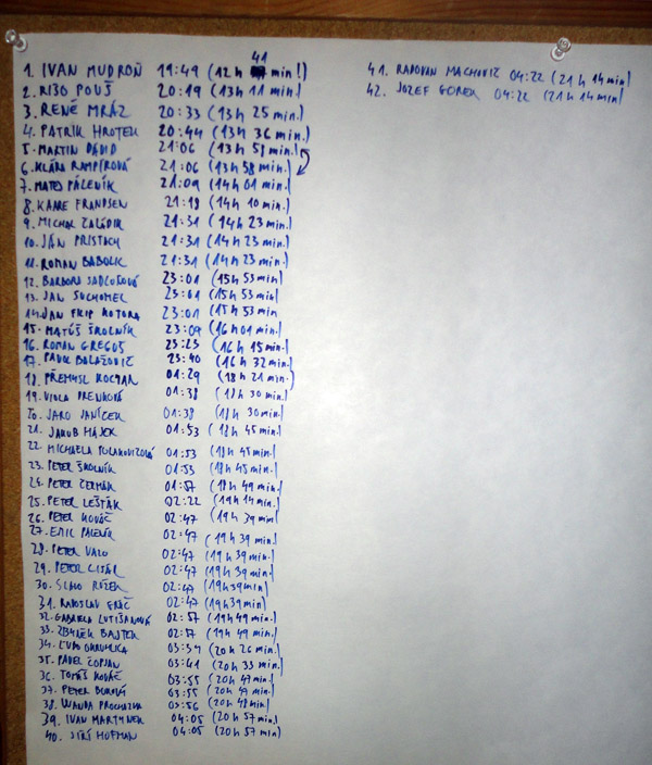 Inak ale počasie ako na objednávku, aj vietor do chrbta zo začiatku, organizácia na jednotku, no parádny masochizmus. Ak vlaňajšie časy prvých dvoch boli slušné, tento rok ich podliezlo až 11 účastníkov – a prvá žena dala šancu len 4 chlapom, piaty došiel s ňou, klobúk dolu! Celkovo vďaka organizátorom za skvelo odvedenú prácu – lebo spraviť podujatie, kde v cieli treba od prvého po posledného čakať 15 hodín a vyhovieť turistom aj „chrtom“, to chce riadnu dávku skúseností! Napríklad kombinácia jonťáku s omasteným cibuľovým chlebom sa ukázala ako recept na ozaj vrcholné výkony :-)