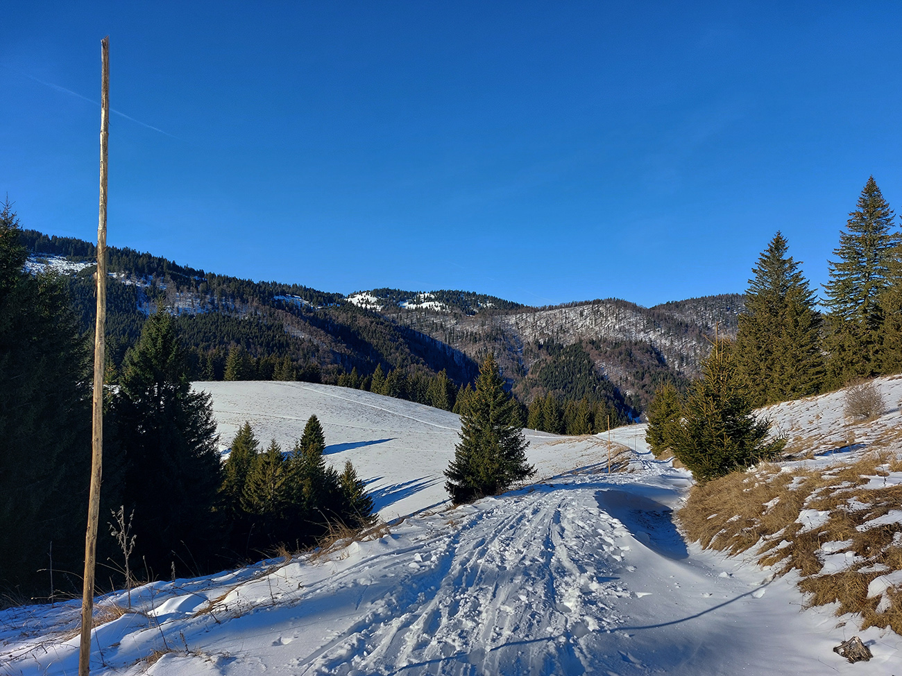 Na lúkach pod Vtáčnikom tiež samozrejme bieda a zjazdík dole ku smerovníku po snehu len vďaka vetru a tomu, že cesta je v ryhe, tak ju snehom trošku zafúkalo.