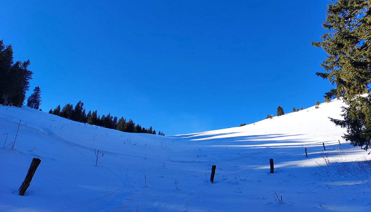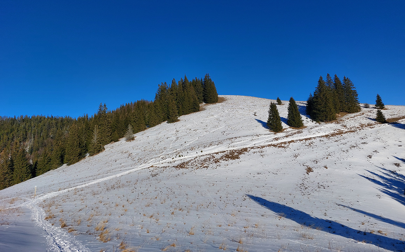 Takže po zjazdovke len kúsok a hneď nástup na Medvedí chodník. Ten centimeter snehu na ňom je uchodený, vytvrdený, až vyleštený a zrána zamrznuto hrkotavý. Húfy piraní tam plávajú, ale všetky vidno zďaleka, tak na výstup komfort. Alebo aj preto, lebo som pre istotu nasadil kameňačky.