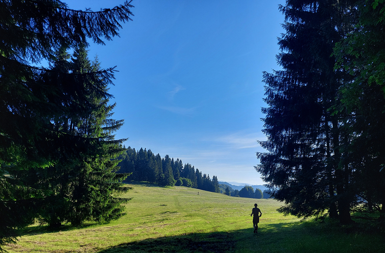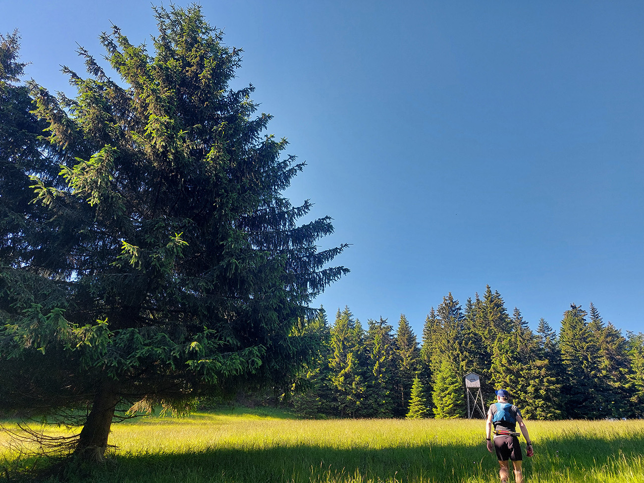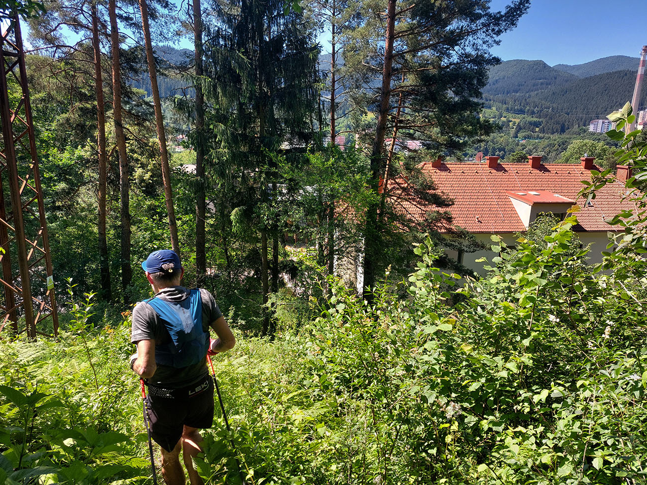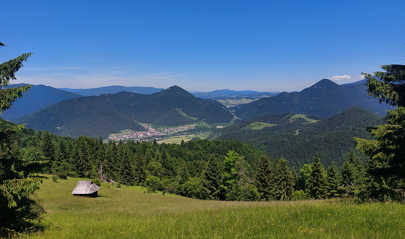 Monotónnosť skončila veľmi pekným úsekom cez Poľanu pod Kútnikov kopec – zase lúky, senníky a výhľady na prvú časť našej trasy na náprotivnom brehu Váhu. Aj keď jeden kus si to zase prestával užívať, ako účinok gélu rýchlo vyprchával a nohy sa začínali motať. Ale nebolo to už ďaleko, a už len dole.