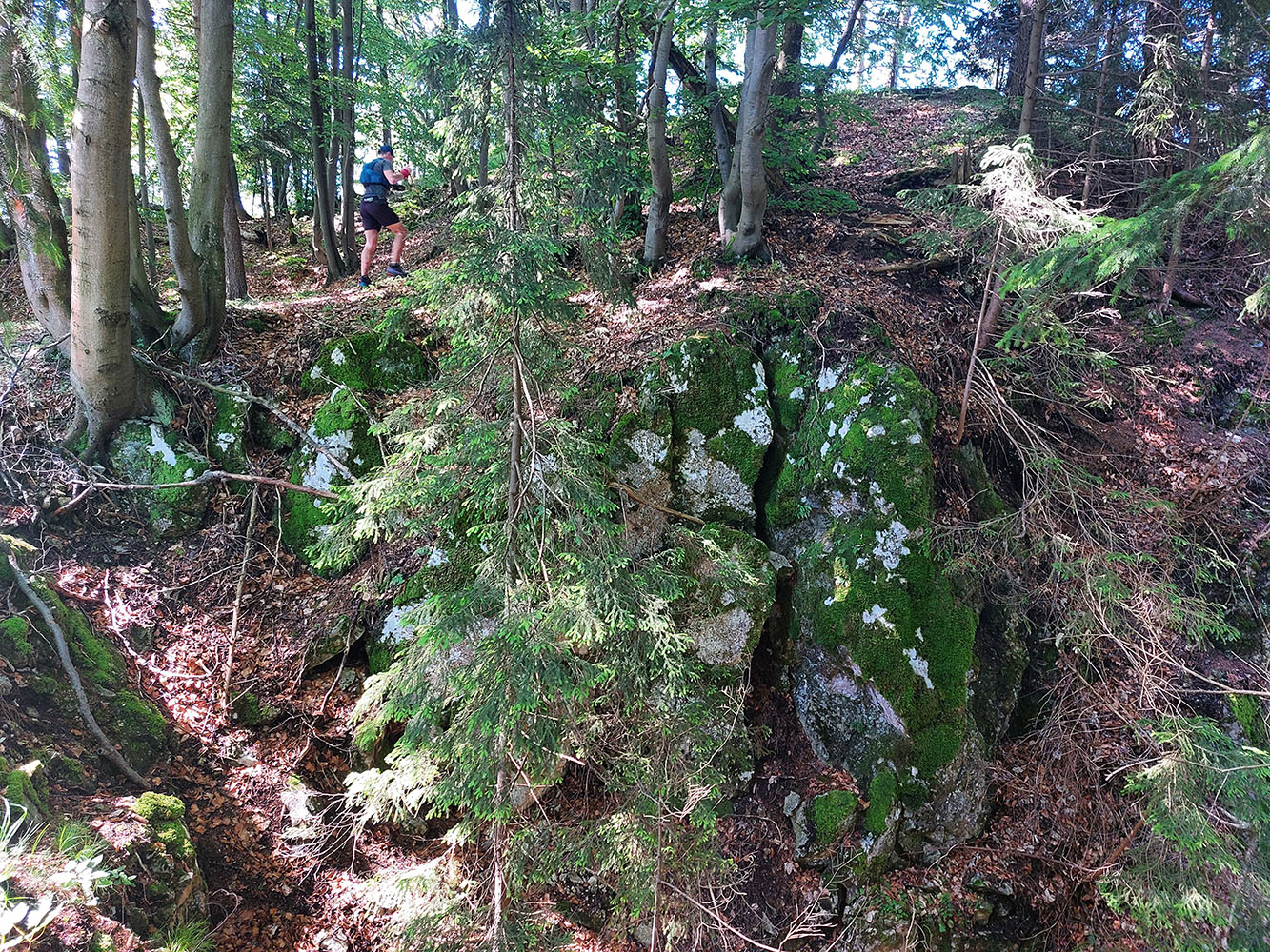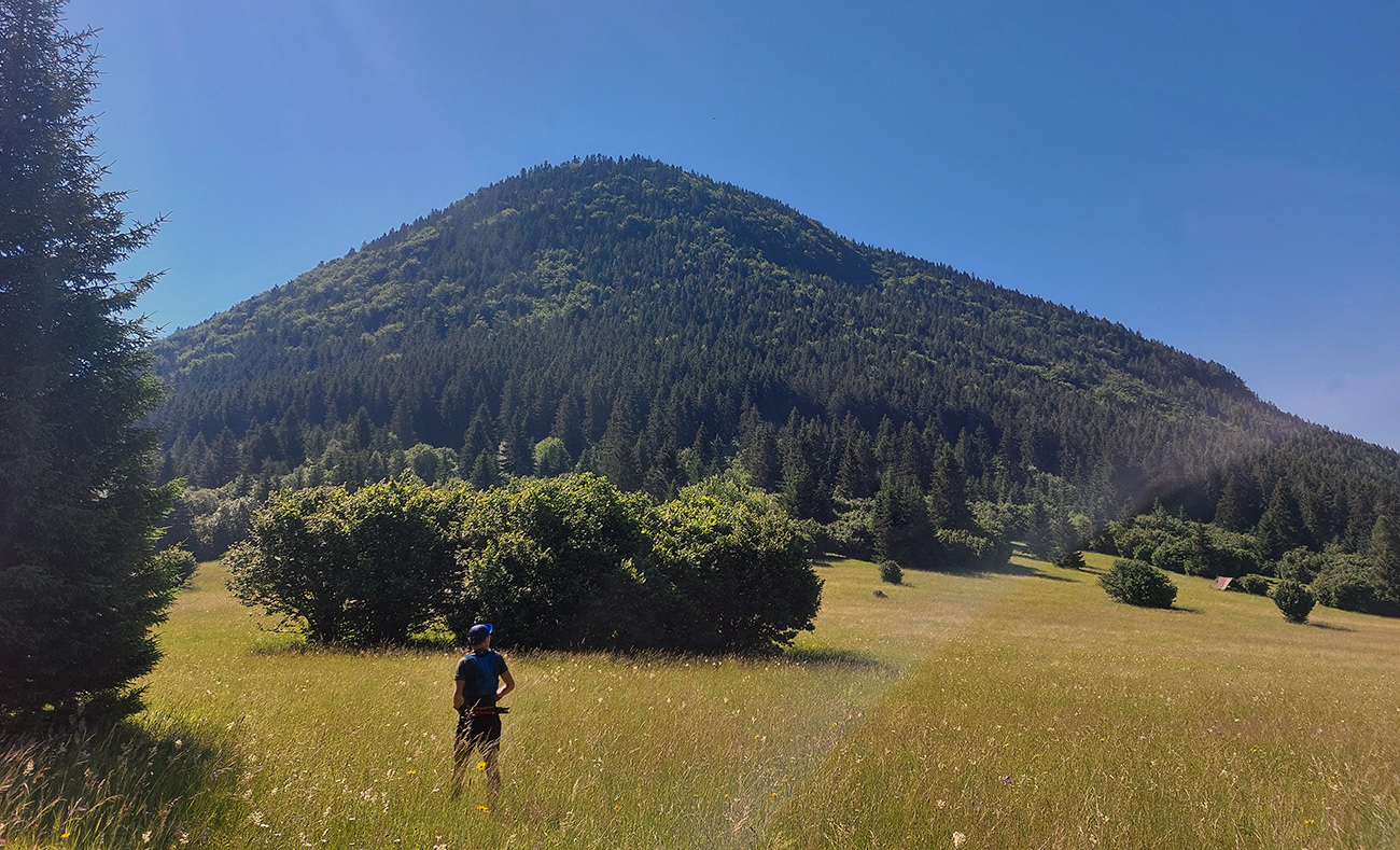 V sedle vpravo vbok a väčšinou pohodlné, mierne stúpanie lesmi a lúkami na Hrdoš. Tipovali sme, či nevyplašíme takto zrána nejaké pasúce sa kusy, ale ani kopyto. Len kliešte boli prítulné (ja doma päť, Majo nenahlásil). Aj cesta bola prítulná, objala ma svojím mäkkým, mľaskavým objatím (veď ako po daždi). Čo už, keď som nerozbehaný a nedvíham nohy. Vyhliadky z Hrdoša zato prudko panoramatické, aj keď smerom na východ ešte trochu proti slnku. Ale ukázali sme si odtiaľ plánovaný obchvat Komjatnej, zbehli poobzerať skalné divy pod vrcholovým bralom, a o chvíľu už sme dupali lúčne cesty ponad dedinu, smer cintorín.