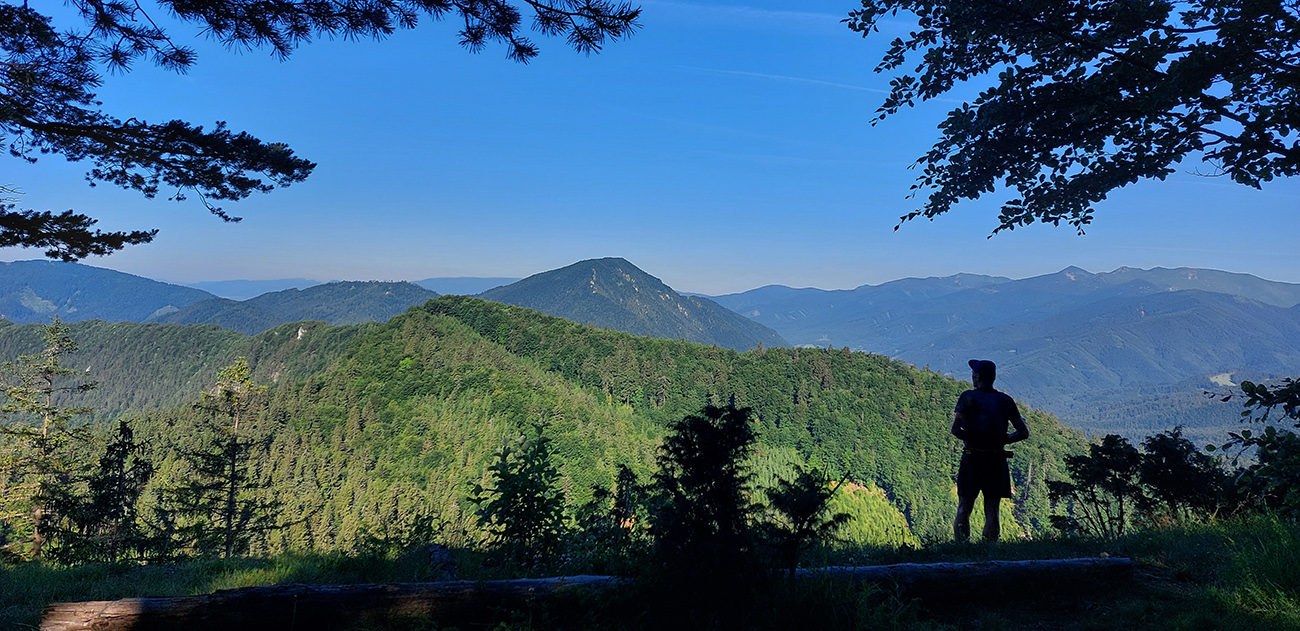 Chodník po temene k výhľadu na RK je ale príjemný, ponad vrcholové prepadlisko, jeho skalné steny, sutiny a machom obrastenú divočinu celkovo. Onedlho už sme vychutnávali desiatovú pauzu s výhľadom na RK city, Nízke Tatry v protisvetle, aj hlásenia staničného rozhlasu.