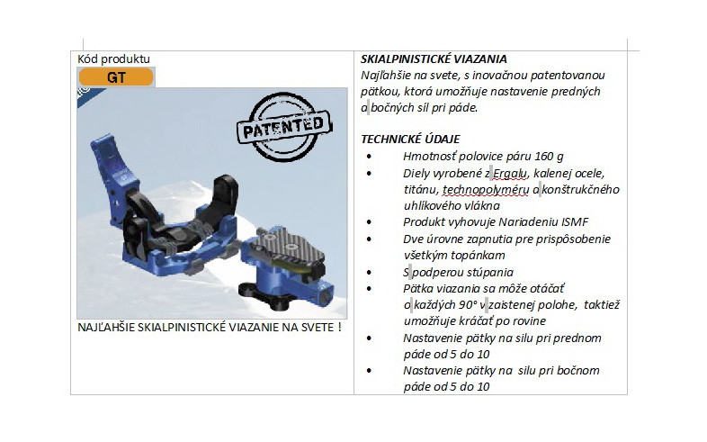 nejakých 35 gramov viac ako preteková verzia, za tých smiešnych 35 gramov dostanete oceľové nezničiteľné účko, robustnejšiu pätku, otáčateľnú do všetkých polôh, nastaviteľné sily pri vypínaní do boku aj hore - rovnako ako na starom dynafite TLT