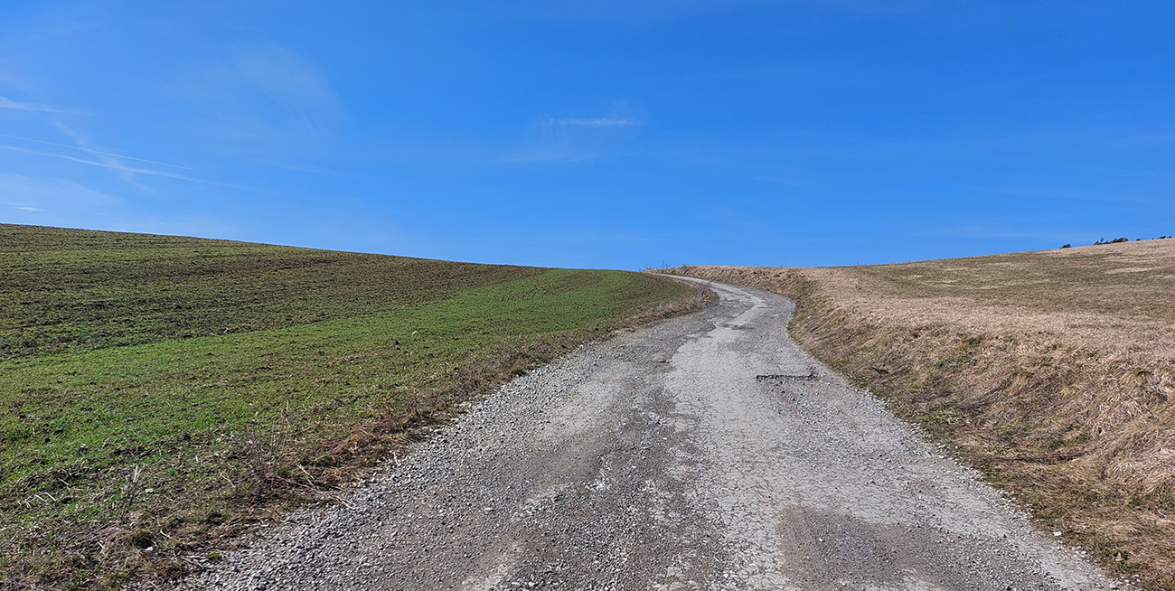 Ďalej sa cesta príjemne vlní po okraji polí a hrany terénu – dúfam len, že nebude moc zablatená traktormi (nebola). Vpravo dole v nive to zúrivo šteboce, život sa tam prebúdza do jari, škoda nepostáť a nezapočúvať sa. NPR Turiec, to je zas jedna rarita minimálne európskeho významu, so svojimi mokraďami, neregulovaným tokom a pestrosťou života ako niekde v dažďovom pralese: