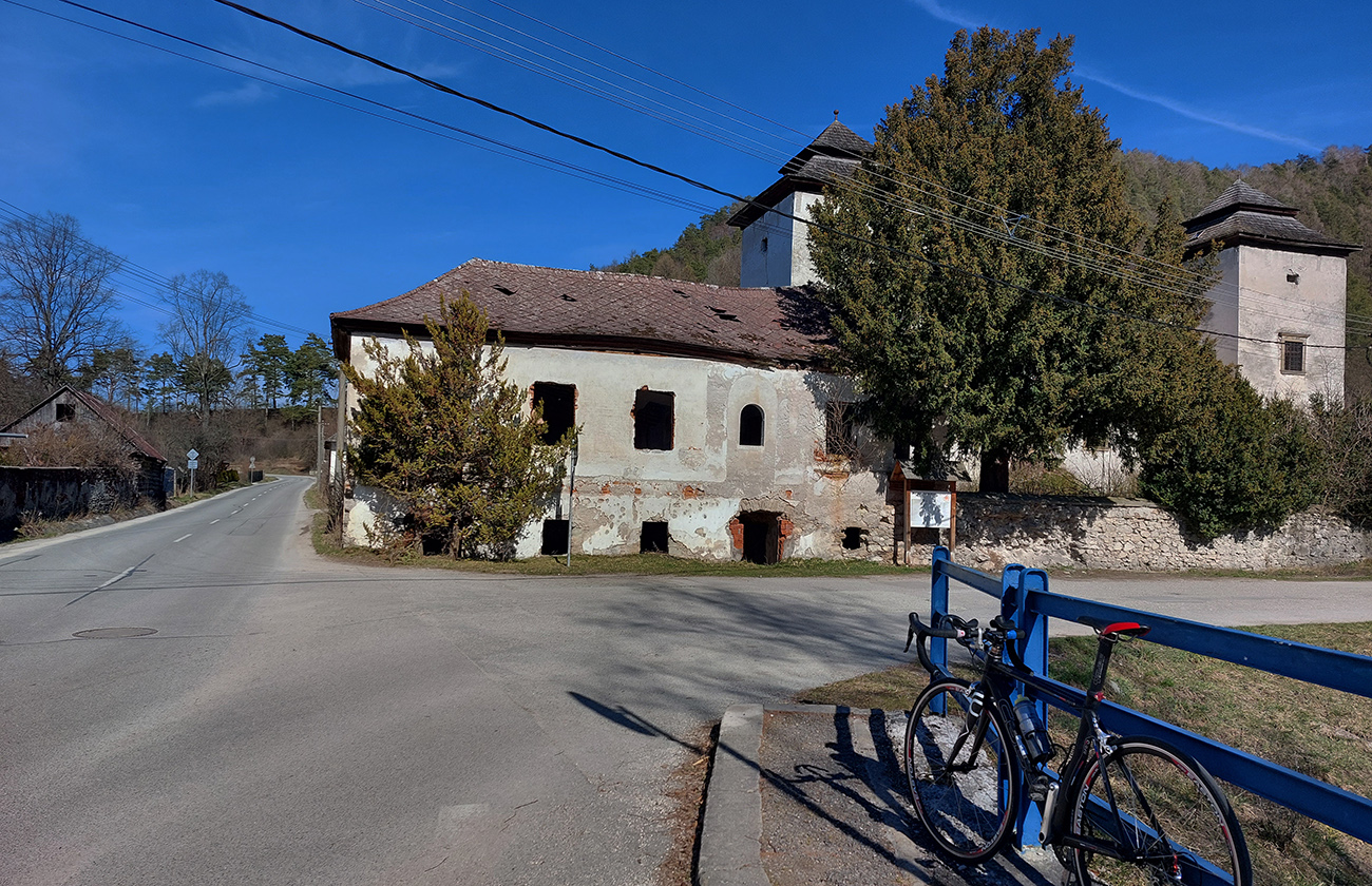 Pred Dolnou Štubňou sa úspešne napájam na mne dokonale známu cestu s hrubým asfaltom, kde viem, že ku koncu budem musieť obísť pár jám, ale to je pohoda. Hlavne sa konečne otáčam k slnku a vetríku chrbtom, začínam sa vracať domov a pre zmenu musím často brzdiť, ako sa mi fičák opiera do chrbta. Aby som to mal správne historicky – etnografické, cez Diviaky sa premotávam tiež malou sľučkou popri Platthyovskom kaštieli. Priamo na odbočke k nemu je ďalší kaštieľ (Tarnóczyovský), prerobený na hotel, keby čosi: