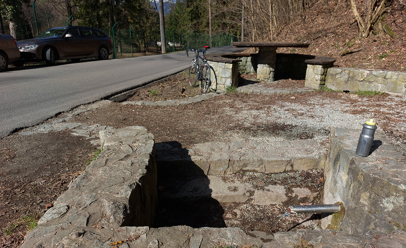 Popod hrad, z Podhradia, cesta tienistou, vlhkou dolinou, ešte so zvyškami snehu na svahoch, ale cesta suchá, už sa práši, a to zima stále neskončila. Až mi vyschlo v ústach z toho sucha, tak ako sa do Štiavničky rútim popri nevkusných milionárskych haciendach a popri ďalšom bývalom révayovskom parku, ubrzdím pri prameni a mixujem v bidóne hornotučiansku s dolnoturčianskou minerálkou. Chutí to fajn: