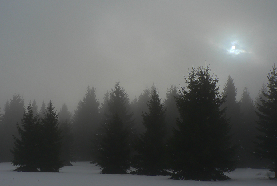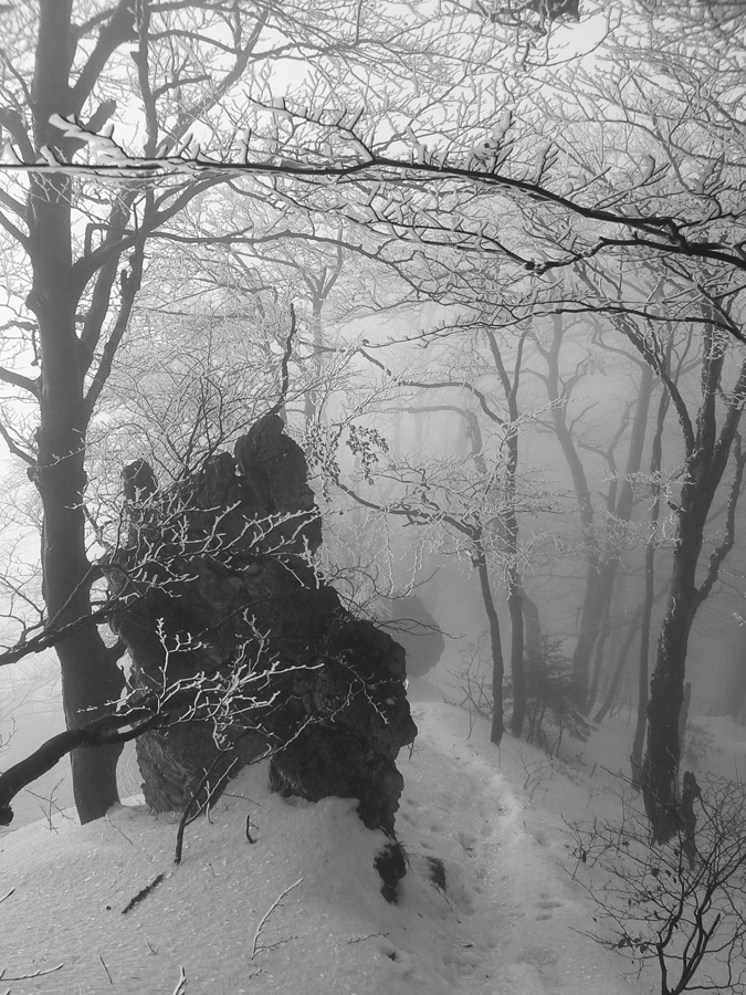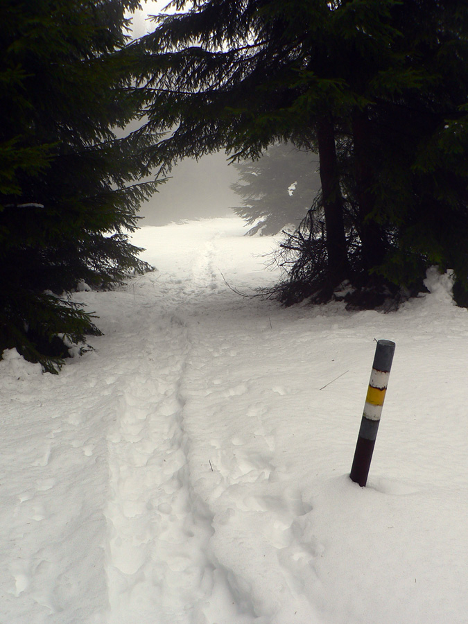 Po traktorovej stope sa ponáram do lesa a v Žaškovskom sedle aj do hmly. Lesné ticho strieda lesný hukot nad hlavou: hore bude poriadne duť! Skúšam aj čosi odfotiť – výsledok je prirodzene čierno-biely :-) Ale chodníček, ako som predpokladal, predupaný – pár ľudí tadeto nedávno (možno včera) prešlo.