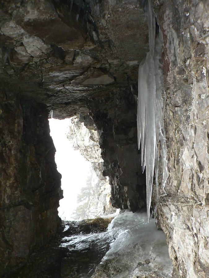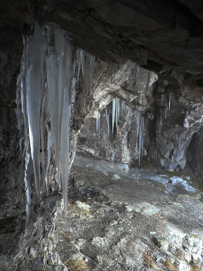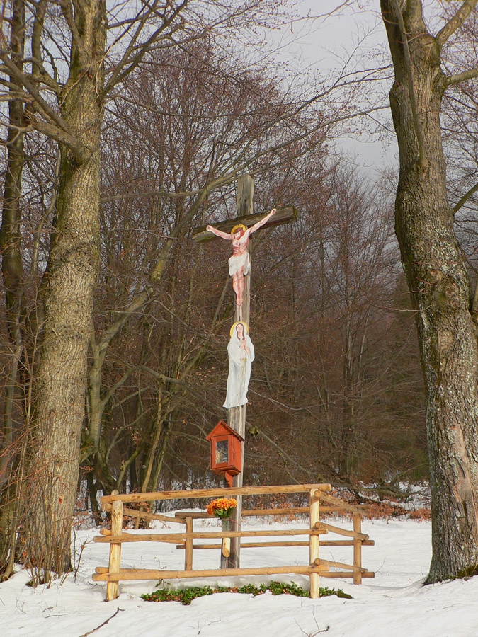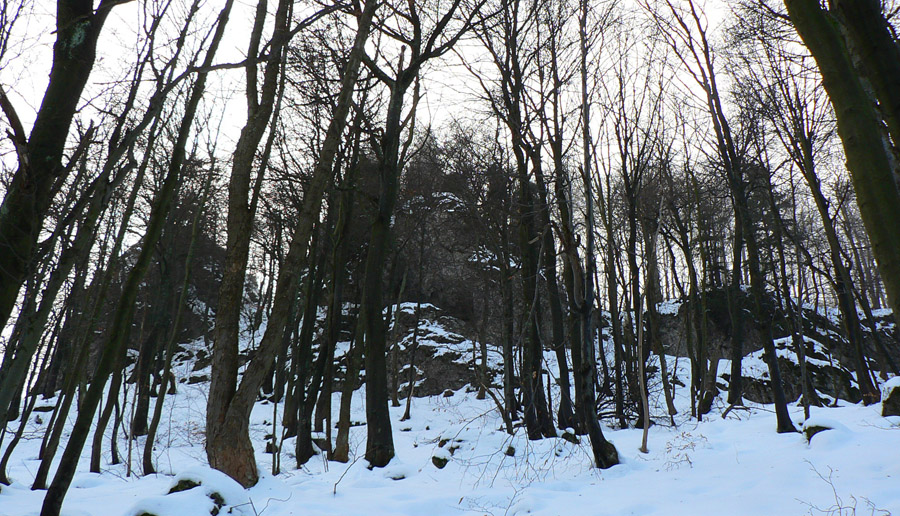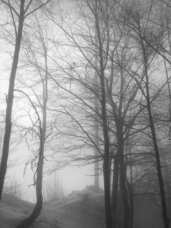 Ide sa ďalej, hrebienkom pomedzi skaly na Zadný Šíp, k známemu krížu. Tam to isté, len viac námrazy na stromoch a hluk z doliny je „sýtejší“. A vietor ma bombarduje námrazou čoraz hustejšie. Neostáva nič, len sa zmieriť s počasím a začať sa kĺzať dolu strminou na Podšíp. Ako strácam výšku, aj „kobercový nálet“ slabne. Tá vetrom obitá námraza ale vyzerá na starom špinavom snehu zaujímavo – ako drevená štiepka, len inej farby :-)