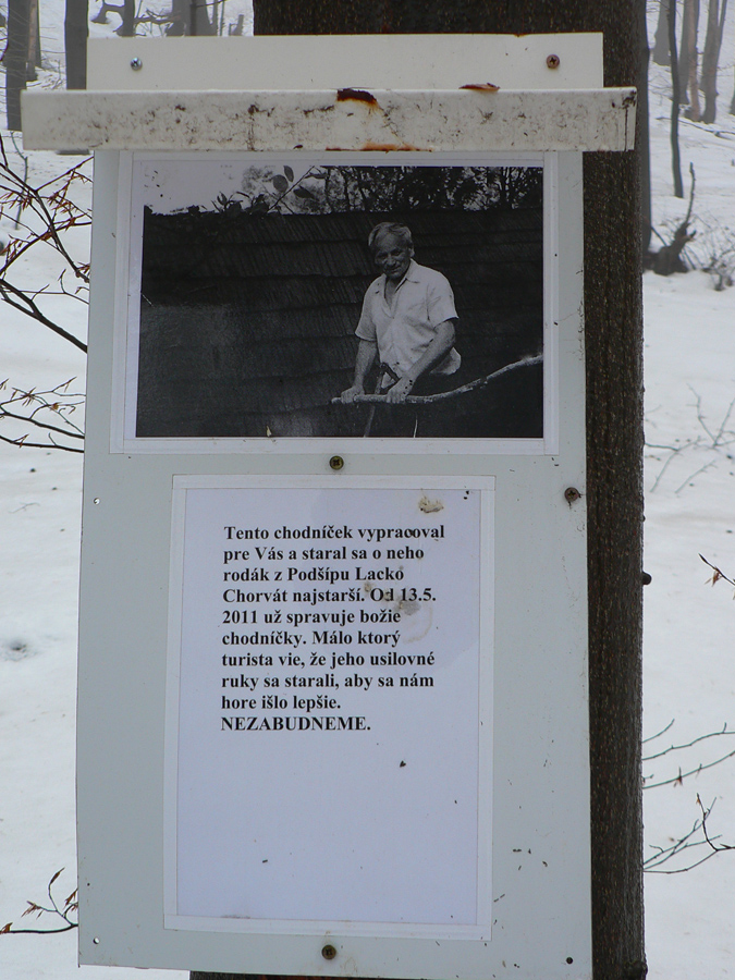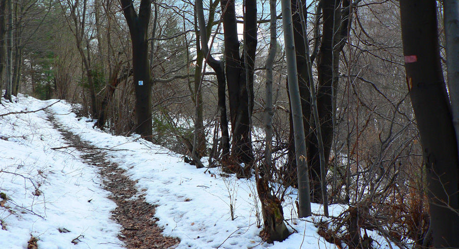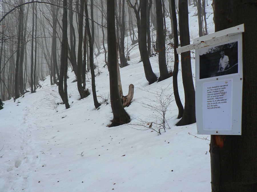 Takže osada Podšíp a ďalšie č-b fotky a o chvíľu už sa brodím čoraz vodnatejšou snehovou kašou po „neznačenom“ chodníku do Stankovian. Pôvodne boli na stromoch červené pásiky, niekde ich ešte vidno. V lete sa dá aj bez nich, teraz, keď je cestička pod snehom, som síce miestami na pochybách, ale smer je zhruba jasný. Len prečo je táto strmina značená ako cyklotrasa??? Malo by tu byť aj upozornenie, že jednosmerná – lebo tlačiť tadeto bajk do kopca, to teda nič moc zážitok :-) Naopak - smerom dole je to miestami celkom príjemný, hravý singlík, aj keď v niektorých pasážach vďaka ťažbe dreva bude treba cez ten bordel prenášať. Dolu pri dedine, kde chodník ústi na cestu, je aj cykloturistický smerovník, ktorý dosť logicky ukazuje, že ide o okruh s vrcholom na Podšípe. Pri pohľade na sklon chodníka hádam väčšine napadne, že smerom hore to bude lepšie po ceste :-)