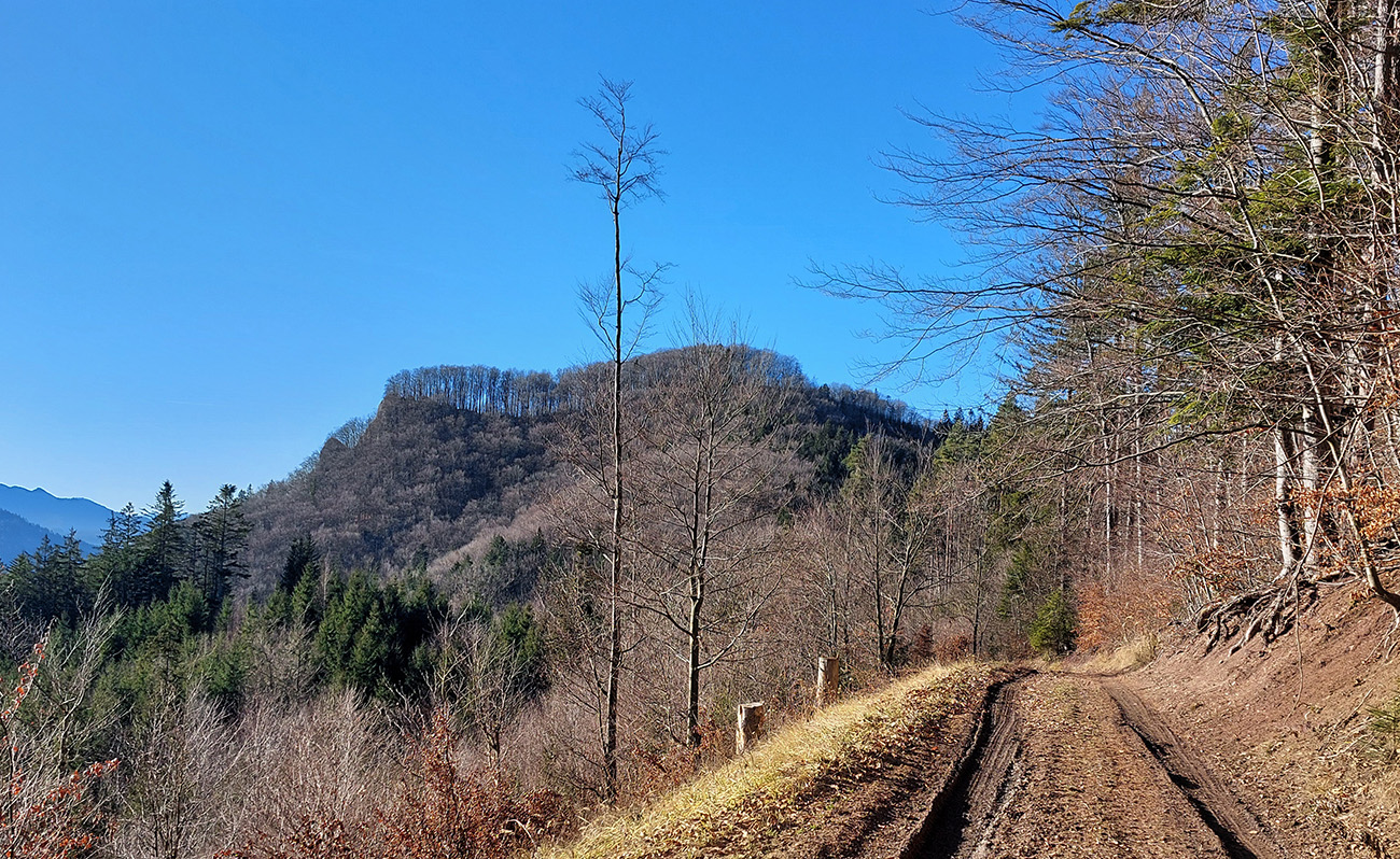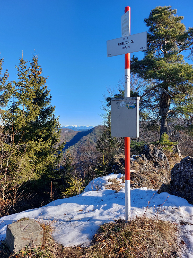 Návrat kúsok po červenej na križovatku zvážnic a z nej pevnou cestou priamo pod Prieložnicu, na lúku so soliskom, kde sa nenápadne odpája chodník na vrchol. Ten je pekne strmý, hore ešte okorenený bralkami, cez ktoré sa treba vyštverať na samý vrchol. Ale aj kus provizórneho zábradlia tam je, v najstrmšom.