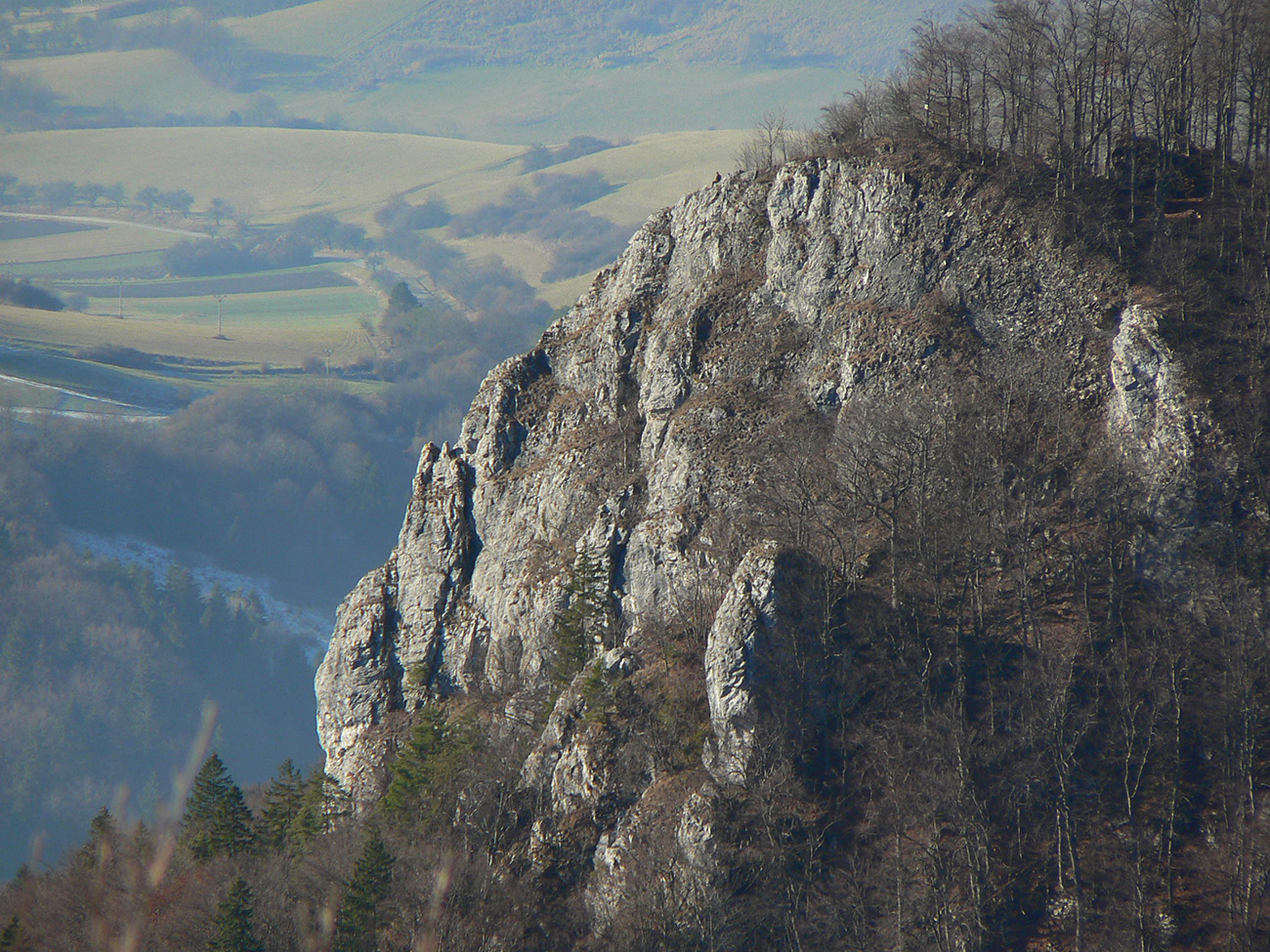 Vrcholové bralo najprudšie a teda s najširším výhľadom padá na juh, no pomedzi stromy je pekne vidieť aj Katovu skalu na západe, Krivánsku Fatru a samotné Podhradie hlboko dolu na severe a na východe aj tie Západné Tatry.