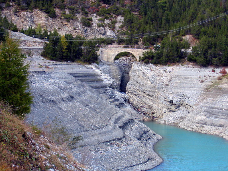 Čaká ma nádherný zjazd asi 1000 v. m., na jeho konci sa mi otvorí výhľad na Lago di Cancano. Vápencové horniny dávajú vode azúrovú farbu. Pokračujem po pobreží z pravej strany. Míňam dvoch starších Talianov. Chlapík za mnou kričí, počujem len slovíčko Galeria. Šlapem ďalej, nie je veľa času na zastávky. Rozmýšlam, čo tým chcel povedať, keď prichádzam pred neosvetlený tunel. Hneď mi je jasné, čo to kričal. Vyťahujem z batohu čínsku diodovku a - nesvieti sakra. Nakoniec ju presvedčím, aby svietila a vydám sa do tmy. Tunel na mape 1:50 000 nebolo dobre vidieť a tak som ho úplne prehliadol. Čelovku musím stláčať prstami, aby kontakty priliehali a takto trasúc sa od strachu, že prestane svietiť prechádzam tunelom.