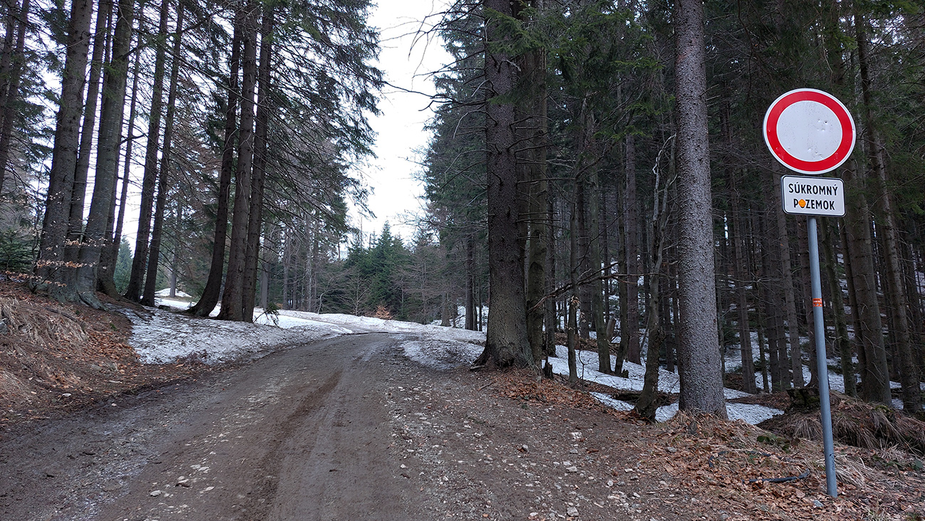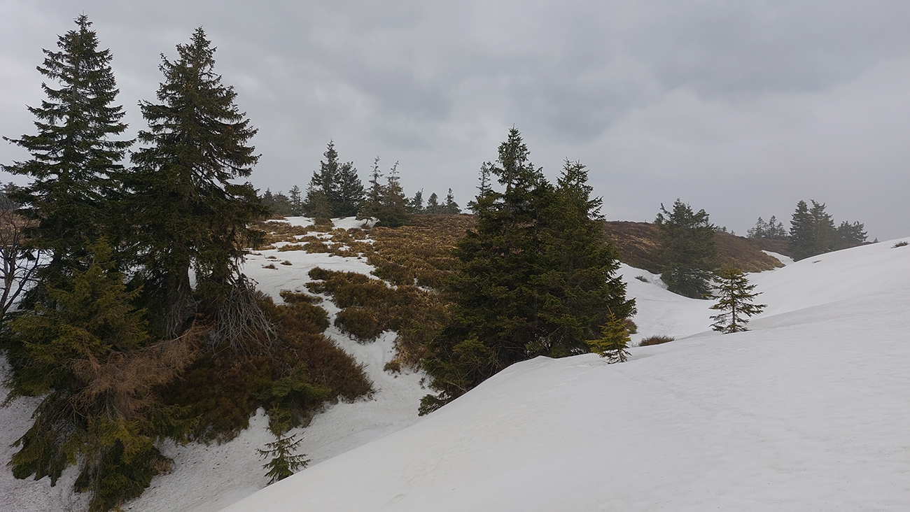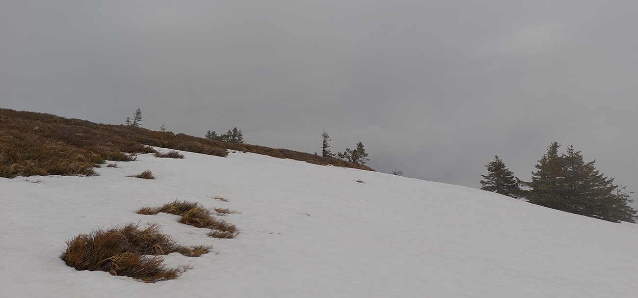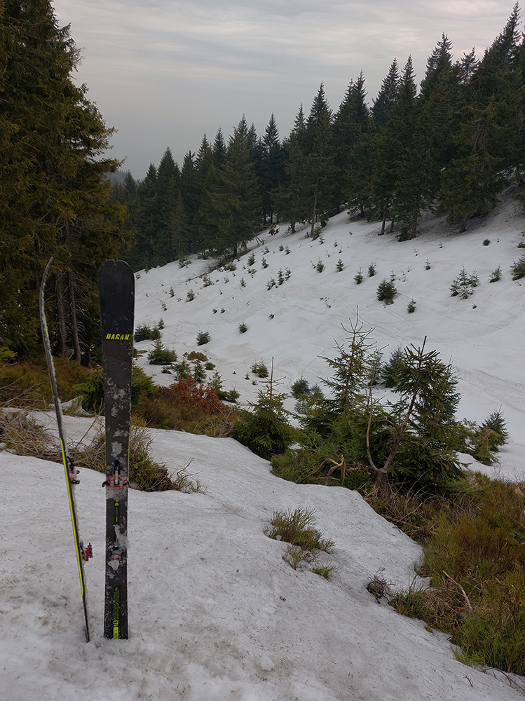 Bol istý zámer posunúť sa ešte viac na sever, na Priekopské hole, ktoré zdola vyzerajú stále krásne, ale hrebeň už je do sucha vytopený, skoro pre bajk. A v lese by chlpatý sneh asi dosť brzdil. A ešte začalo aj pršať, ohlasovaný front sa blížil. Ako inak, veď prvý voľný deň po slnečných pracovných... Tak hybaj nazad. Ešte raz ma stiahla Stará slalomka a ešte komfortnejší výstup z nej bol, lebo po vlastnej stope. Potom už rýchlo dole po piste, lebo lejak.