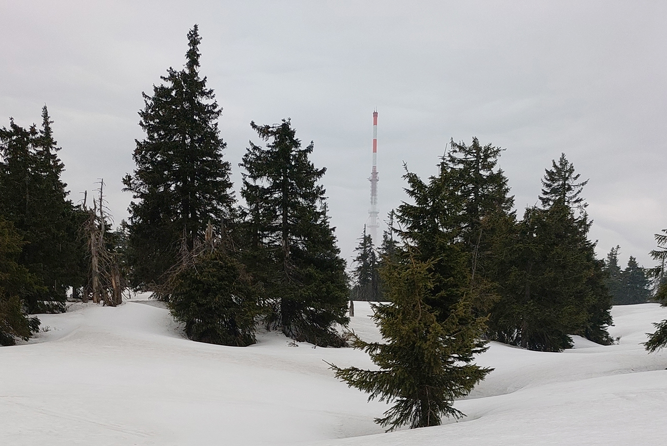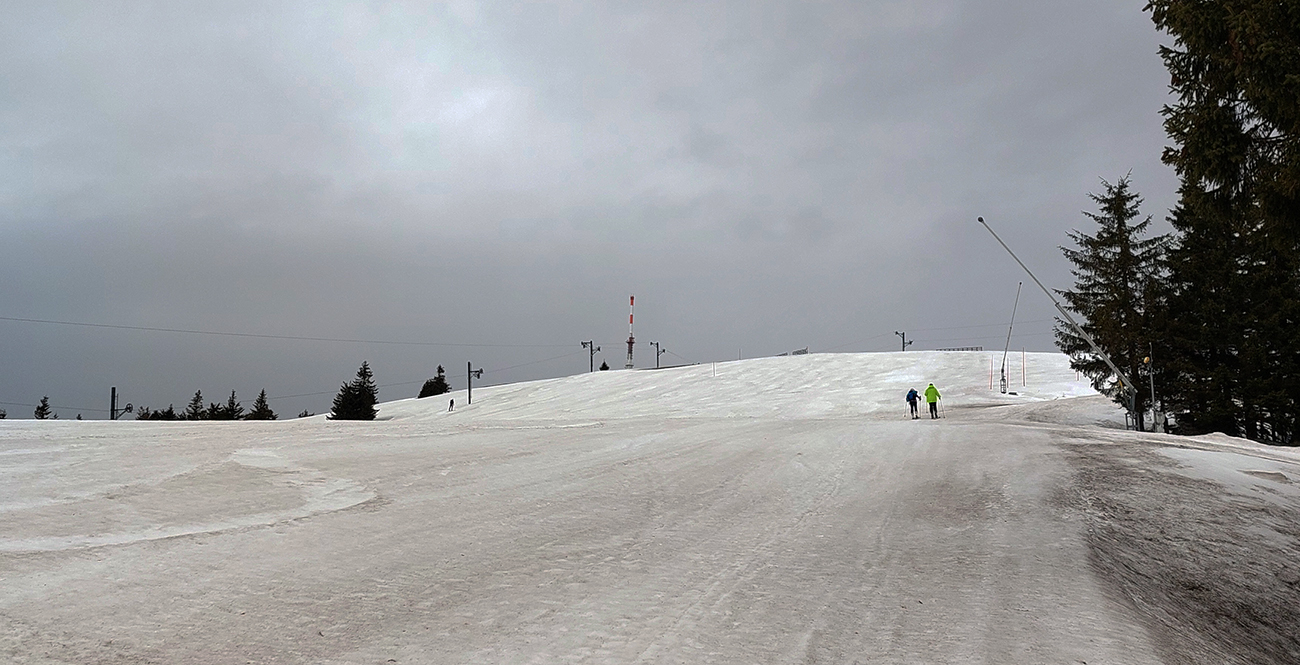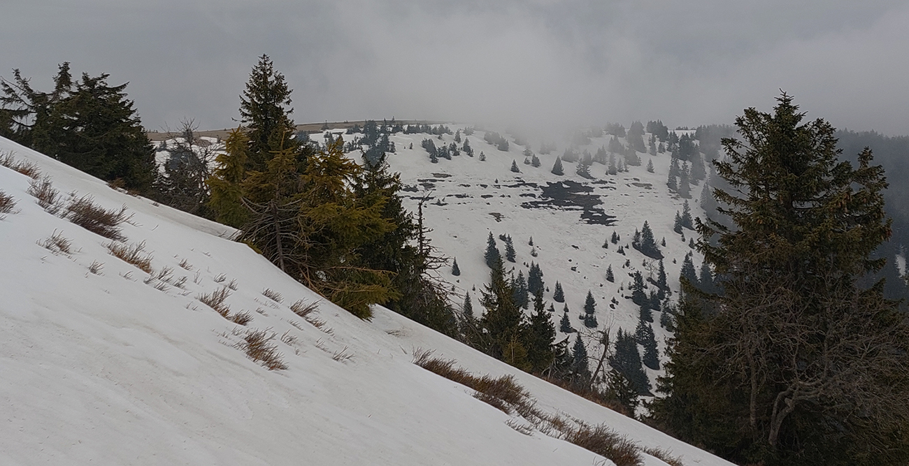 Bol istý zámer posunúť sa ešte viac na sever, na Priekopské hole, ktoré zdola vyzerajú stále krásne, ale hrebeň už je do sucha vytopený, skoro pre bajk. A v lese by chlpatý sneh asi dosť brzdil. A ešte začalo aj pršať, ohlasovaný front sa blížil. Ako inak, veď prvý voľný deň po slnečných pracovných... Tak hybaj nazad. Ešte raz ma stiahla Stará slalomka a ešte komfortnejší výstup z nej bol, lebo po vlastnej stope. Potom už rýchlo dole po piste, lebo lejak.