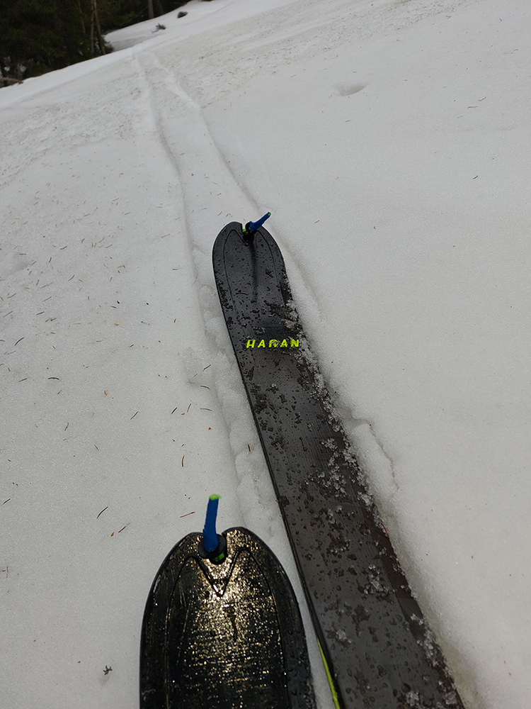 Teoreticky sa dá už od studničky, ale hneď za zákrutou by bolo treba viackrát prenášať, predsa je len zvážnica otočená na juh. Tak som začal vyššie, od spodnej stanice sedačky. Ďalšia výhoda zjazdovkového skifitnesu: rovný, utlačený, nosný firn, na vrchu mierne natopený, čiže komfortný výšľap aj lyžba.