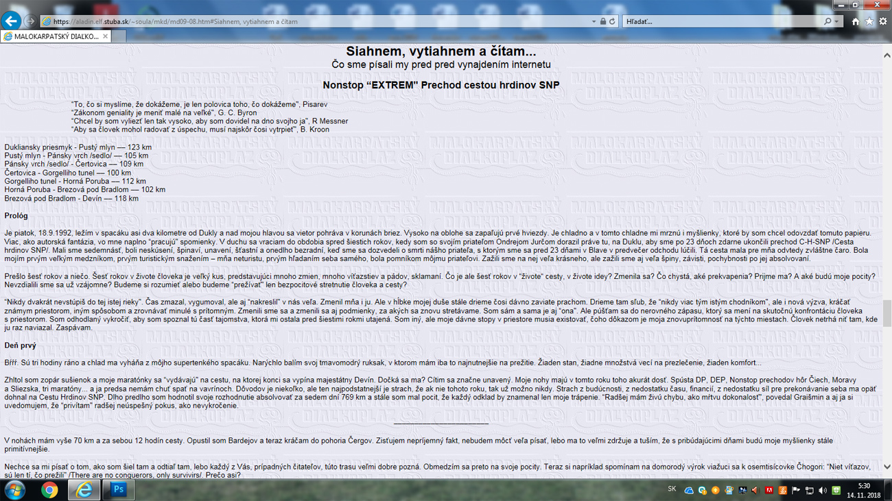 Zhltol som zopár sušienok a moje maratónky sa “vydávajú" na cestu, na ktorej konci sa vypína majestátny Devín. Dočká sa ma? Cítim sa značne unavený. Moje nohy majú v tomto roku toho akurát dosť. Spústa DP, DEP, Nonstop prechodov hôr Čiech, Moravy a Sliezska, tri maratóny... a ja predsa nemám chuť spať na vavrínoch. Dôvodov je niekoľko, ale ten najpodstatnejší je strach, že ak nie tohoto roku, tak už možno nikdy. Strach z budúcnosti, z nedostatku času, financií, z nedostatku síl pre prekonávanie seba ma opäť dohnal na Cestu Hrdinov SNP. Dlho predlho som hodnotil svoje rozhodnutie absolvovať za sedem dní 769 km a stále som mal pocit, že každý odklad by znamenal len moje trápenie. “Radšej mám živú chybu, ako mŕtvu dokonalosť", povedal Graišmin a aj ja si uvedomujem, že “privítam" radšej neúspešný pokus, ako nevykročenie.