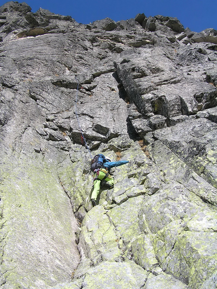 Tu sa naväzujeme. Pôjdeme dve dvojky za sebou. Následuje dĺžka pekným komínikom, po asi 40 metroch štandujeme na plošine vpravo. Tu už začína (aspoň pre nás) vážnejšie lezenie. Podľa sprievodcu je to za V. Zakladáme niekoľko vlastných istení do veľmi peknej, kompaktnej tatranskej žuly. Tretia dĺžka končí štandom na platni. Sú tam skoby,.
