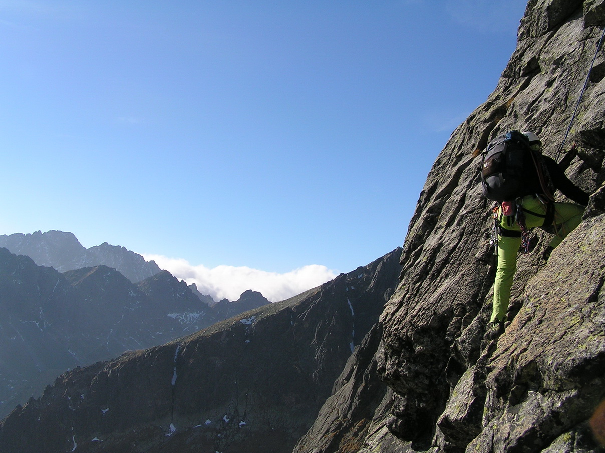 Matúš šiel viac vľavo a v tomto momente už lezie pilierom piatu dĺžku. Ani jeden z nás si nie je istý, kadiaľ presne to malo ísť, ale na pilieri už je smer jasný. Chalani nám utekajú, na pilieri je miesto kde musí aj druholezec kúsok zliezať exponovanú hranu.