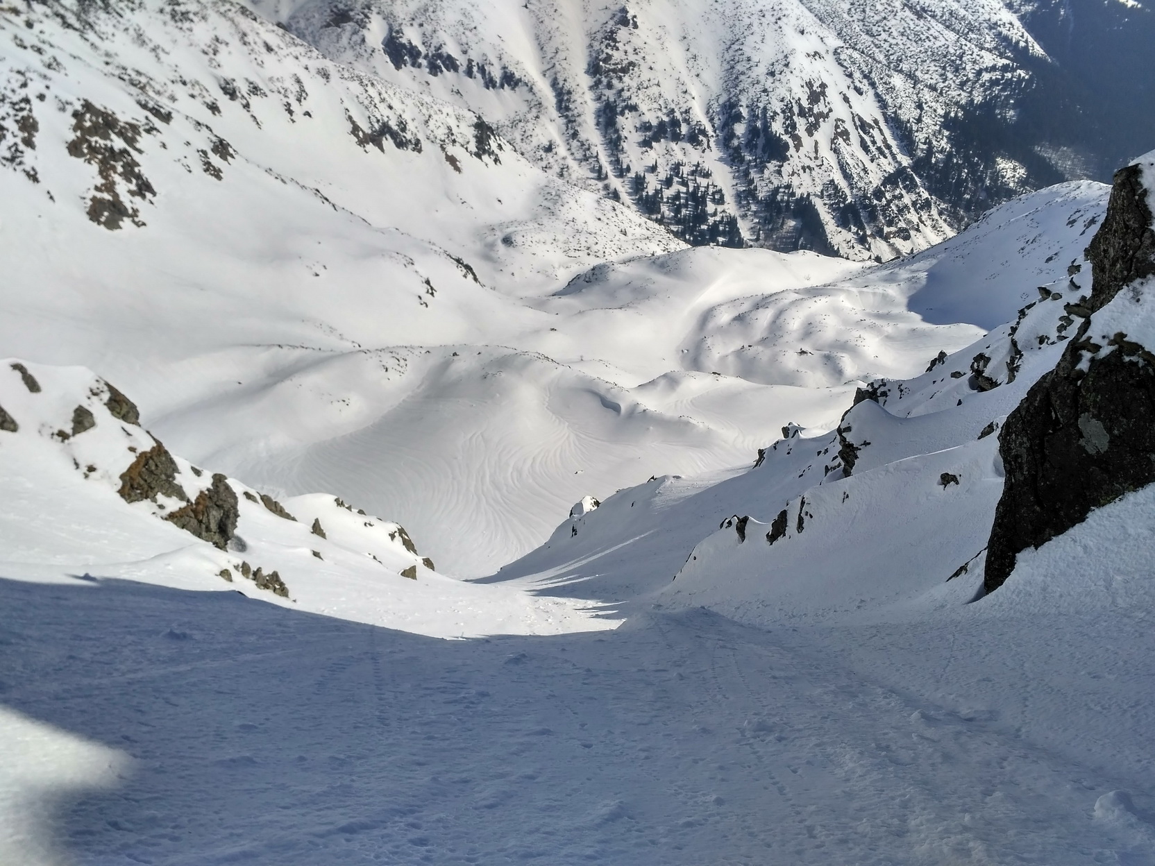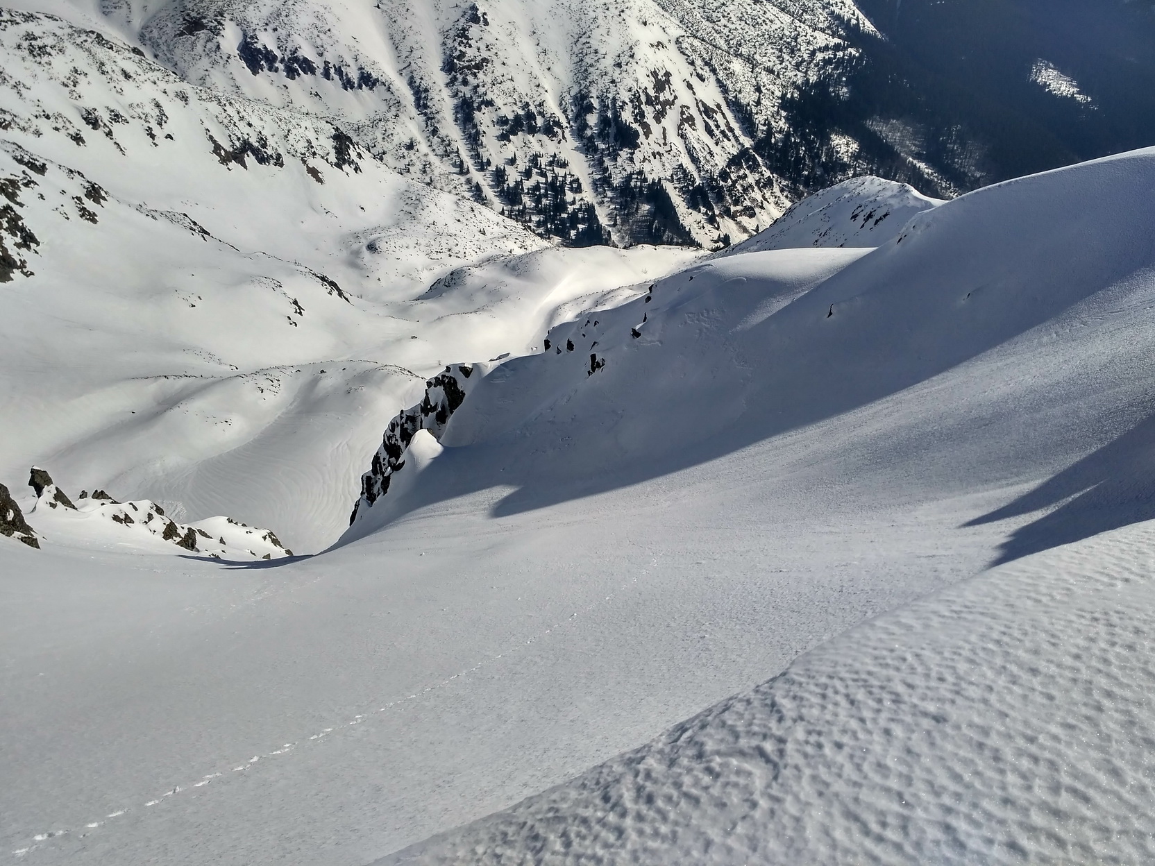 Lyže na batoh a ide sa hore obzrieť pripravenosť slečny odmietavej. Ľavá strana (z pohľadu výstupu) je krytá hrebienkom a slnko koncom marca dostáva len na krátky čas zrána. Aktuálne je už v tieni a zmäknúť nestihla. Aj sneh je tu, pre viac menej stály tieň, horší. Pravá strana je na tom lepšie. Ba až ideálne. Firník, ako sa na správny zážitok patrí. Takže rýchlo hore neprepásť správny moment. Po prekonaní hrany preveja iný svet - stolová hora, futbalové ihrisko – poste Skalka. Prestrojím a ide sa na to. Predtucha bola správna a konečne znižujem – 1:3 - hoci vzhľadom na kvalitu zážitku by to mohlo byť aj za dva. Nemal by som sa veľmi rozpisovať, aby to nevyznelo impertinentne. Takže len veľmi stručne: