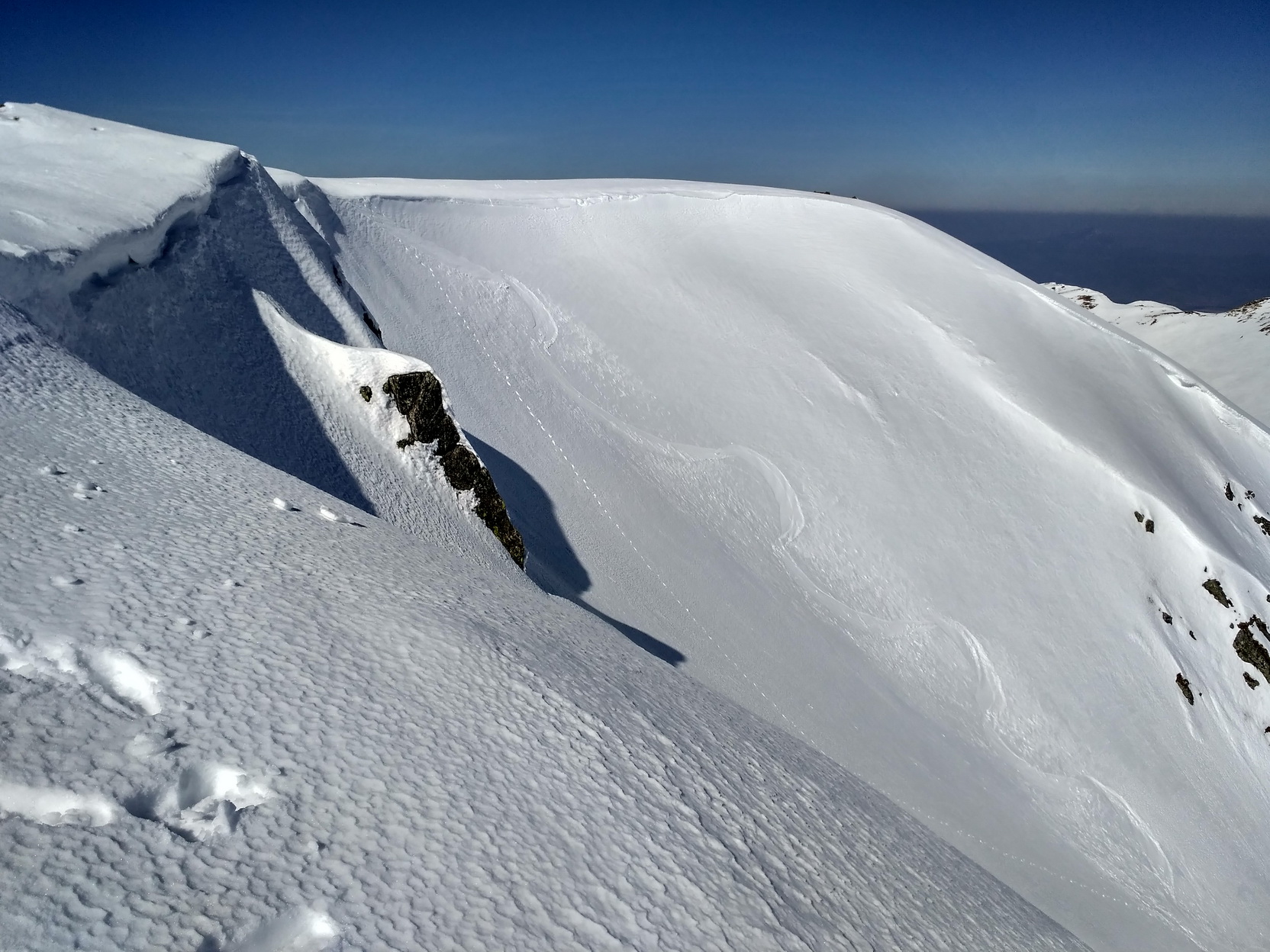 Z plochej vrcholovej pláne priamo cez stred okrajovej hrany do luxusnej mušle meniacej sa v žľiabok s jasným rozhraním ľadovo nedotknuteľného a vláčne pripraveného. Stále hlbšie a hlbšie, až k dolným priestrannejším partiám opatrne zľava obchádzajúc rizikové chladné miesto.