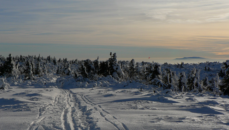Okolo Veterného to nie je veľmi vyfúkané, dá sa aj tam, aj kajtisti sa už vozia. Odjazd dolu je najistejší samozrejme po zjazdovkách a po ceste - po nej sa dá dostať až takmer nazad do sedla za Hradišťom. Zo Strání sa vraj dá na pásoch hore až od dela. Dolu len prvých pár zákrut starej cesty. Je tam bordel ešte z toho, čo v lete drevo ťahali. Ale ide front, tak hádam pribudne bieleho...
