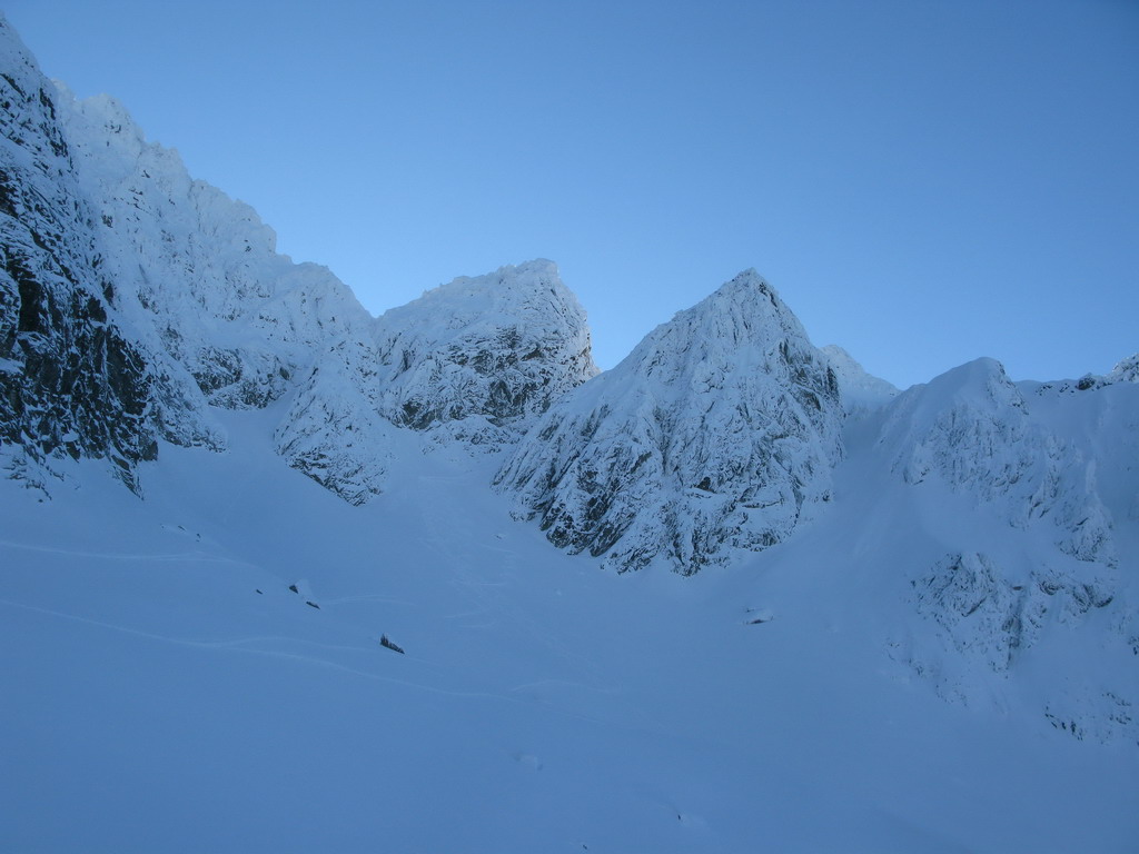 Do úplnej tmy už len pár minút. Rýchlo pásy do batohu a šup ho dole. Po zamrznutom a rozrýľovanom žľabe. Len nezlomiť lyžu!