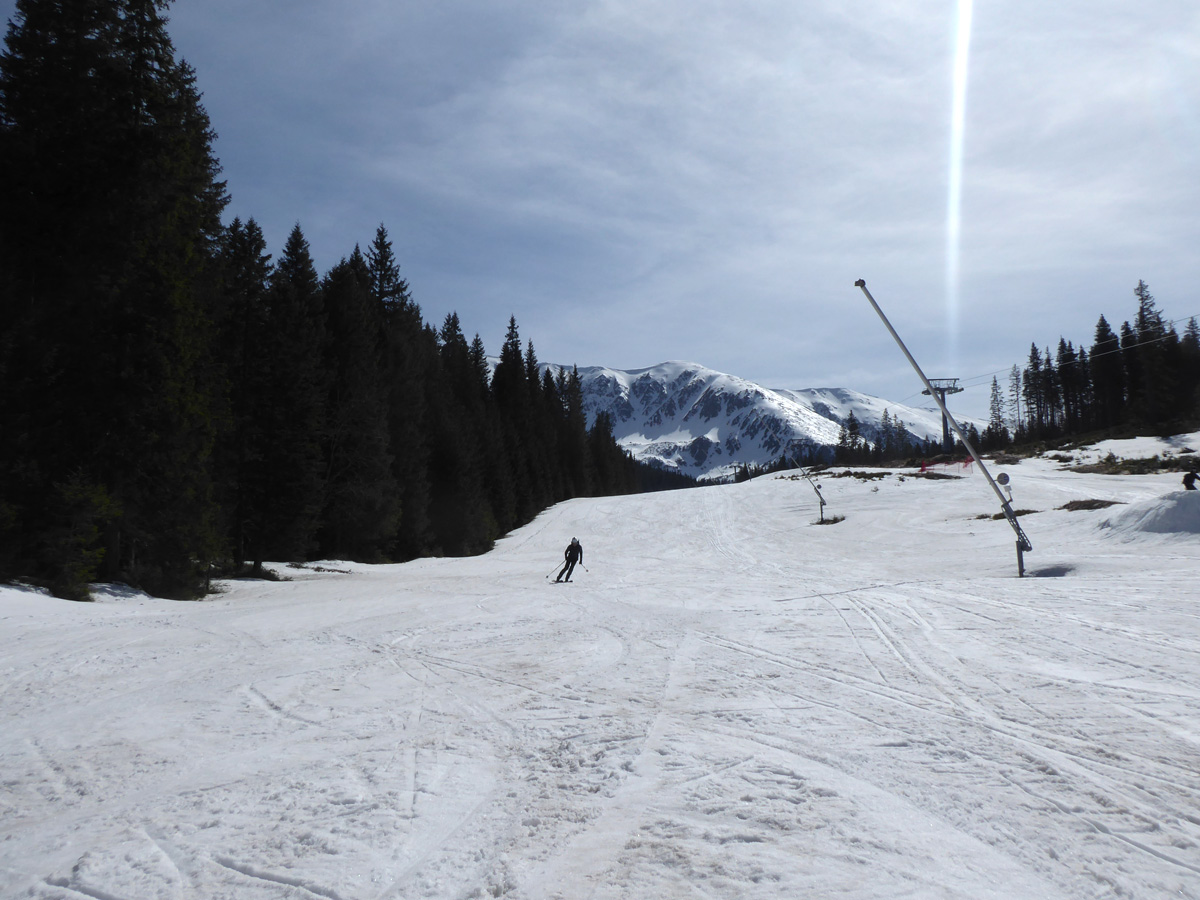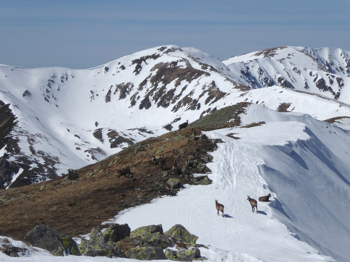 Chvíľu postávame a dávame prednosť v jazde čriede kamzíkov.Všetky okrem jedného sa ťahajú na juh,keď nás vidia.Ten jeden ešte ide kúsok hrebeňom a v mieste bez preveja skočí do severného svahu.Potom ho vidíme ako sa chladí v tieni.Huncút.Pred nami vľavo Skalka,Chabenec a vzadu komplet Krivánska MF.Onedlho sme v sedielku,ktoré bolo vystavené napriamo slniečku a tak konečne prestrojujeme do lyží.Zjazd fantastický,až po smerovník pri potoku,kde vypíname a lesíkom sa ťaháme po zjazdovku,kde na terase zavretého bufetu chvíločku vstrebávame zážitky dnešného dňa.Po prázdnej zjazdovke schladzujeme telesné schránky a lúčime sa pozdravmi vysmiatych tvárí.