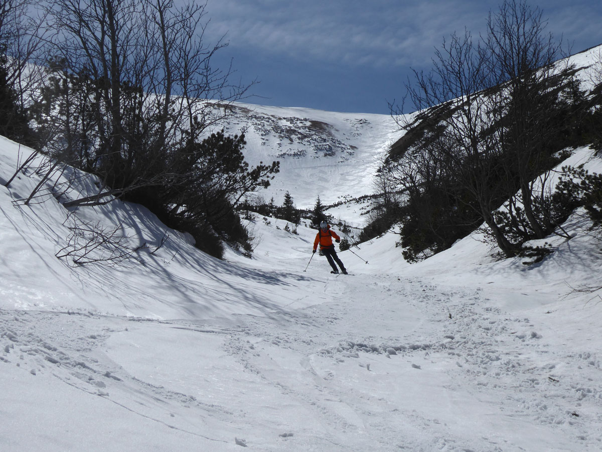 Štartujeme na Brhliskách v slnečnom počasí a pri nejakých mínus dva – úplný ideál.S naberajúcou výškou pri odbočke starého vleku v smere do lesíka je aj nový sneh,ktorý dáva o sebe vedieť pri zmene teploty vytváraním papúč na lyžiach.Takže skladáme a usilovne voskujeme.Zopár traverzíkov a ideme do mačiek,už je tvrdo,expozícia sa stupňuje,naväzujeme sa.Pri výšľape obzeráme vľavo známe frírajdové zóny,ktoré veru tak rýchlo neodmäknú a viac vpravo potencionálne našu dnešnú zjazdovku.Čelom vzad a počas celého dňa Vysoké, Západné aj Babia hora a Pilsko.