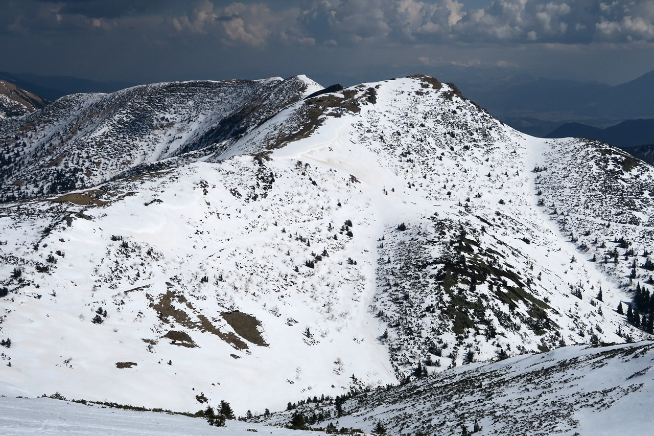 Dole lepíme mokré pásy a ťaháme sa späť na Chleb žľabom smerujúcim k hornej stanici kotvy.Je jasné,že aj tu to stihlo trochu odmäknúť tak pokračujeme k vrcholu.Zaťahuje sa.Tesne pod vrcholom prepíname do zjazdového módu lebo vrch je tráva.Chrbtom Chleba so zatočením na brucho povedľa výstupového žľabu užívame jar vo Fatre.Nižšie v nafúkaných miestach sem tam vata,ktorá nám pripomína byť v strehu.Ďalej lyžujeme až na miesto kde sme ráno zapínali..