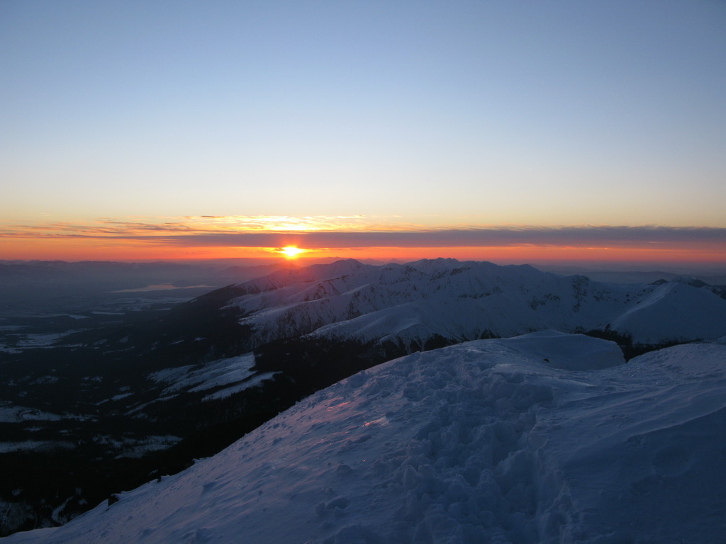 Vrcholová eufória. Slnko práve zapadá. Podarilo sa to, čomu sme ráno vôbec neverili. Rýchlo pár fotiek. Pásy dole. Ešte jedna fotka na samospúšť. Dnes sme toho moc nepofotili...