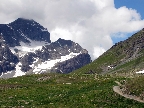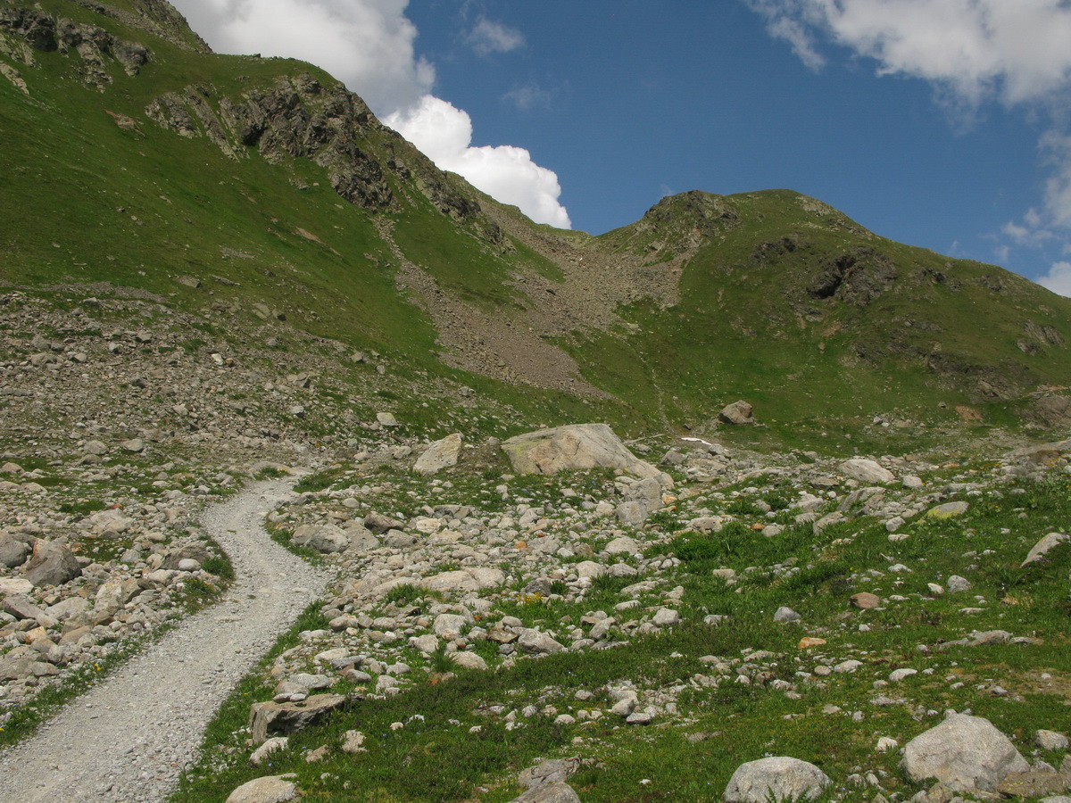 V Bergune sme sa zorientovali rýchlo, doplnili sme vodu vo fontánke a vo veľkej horúčave začíname stúpať. Najprv asfalt, potom štrková cestička a na záver parádny chodníček. Je vidieť, že to tu bolo upravené malým bagríkom a vznikol tak pohodový singlík. Zdá sa mi však trochu zbytočne široký... To pochopím až hore na chate, keď zbadám zásobovací chatový ratračik.