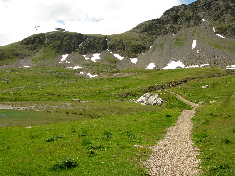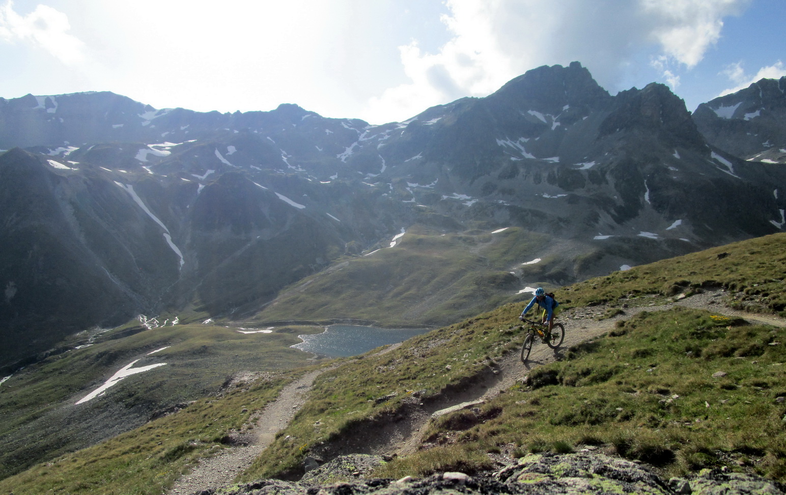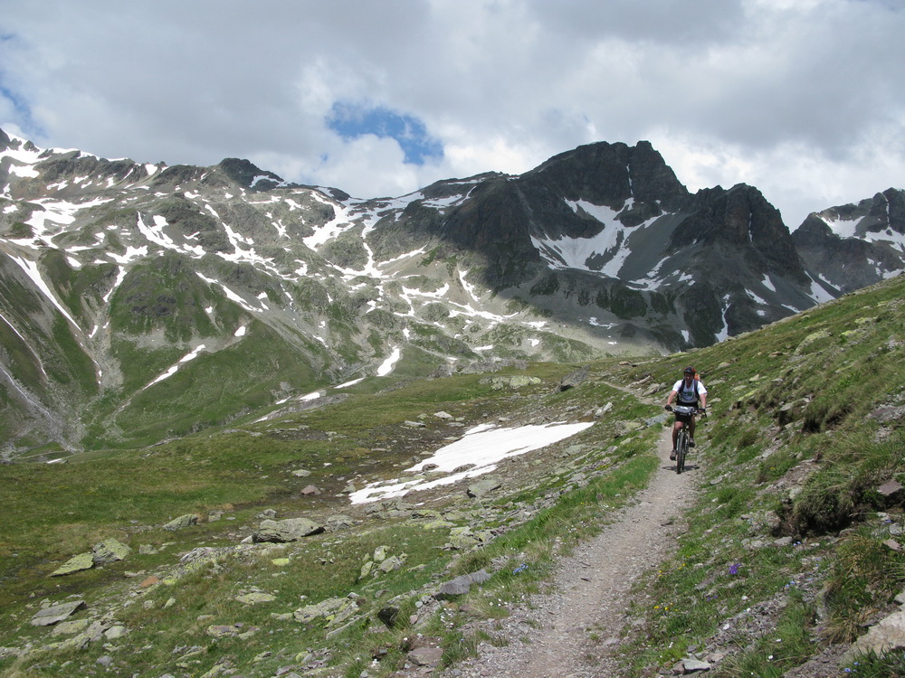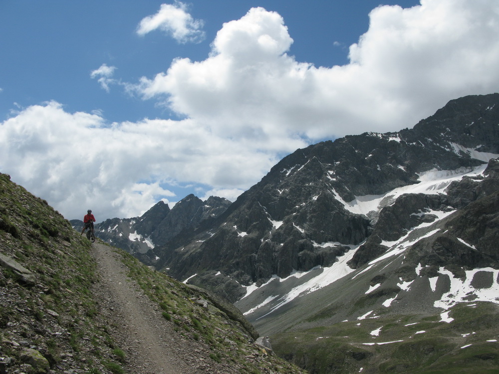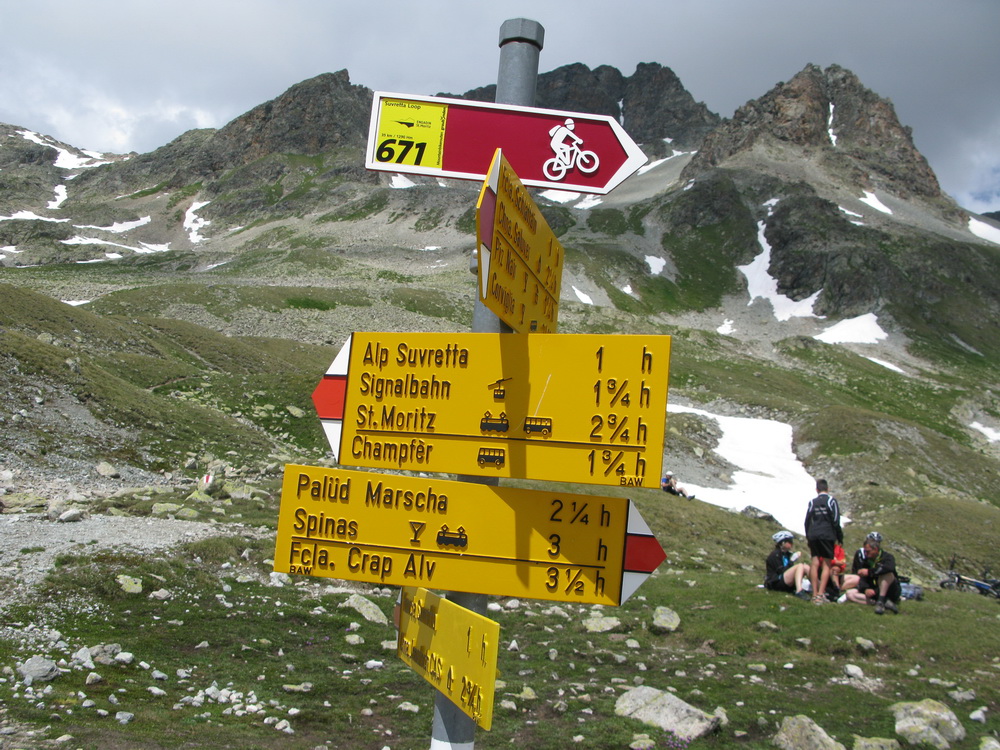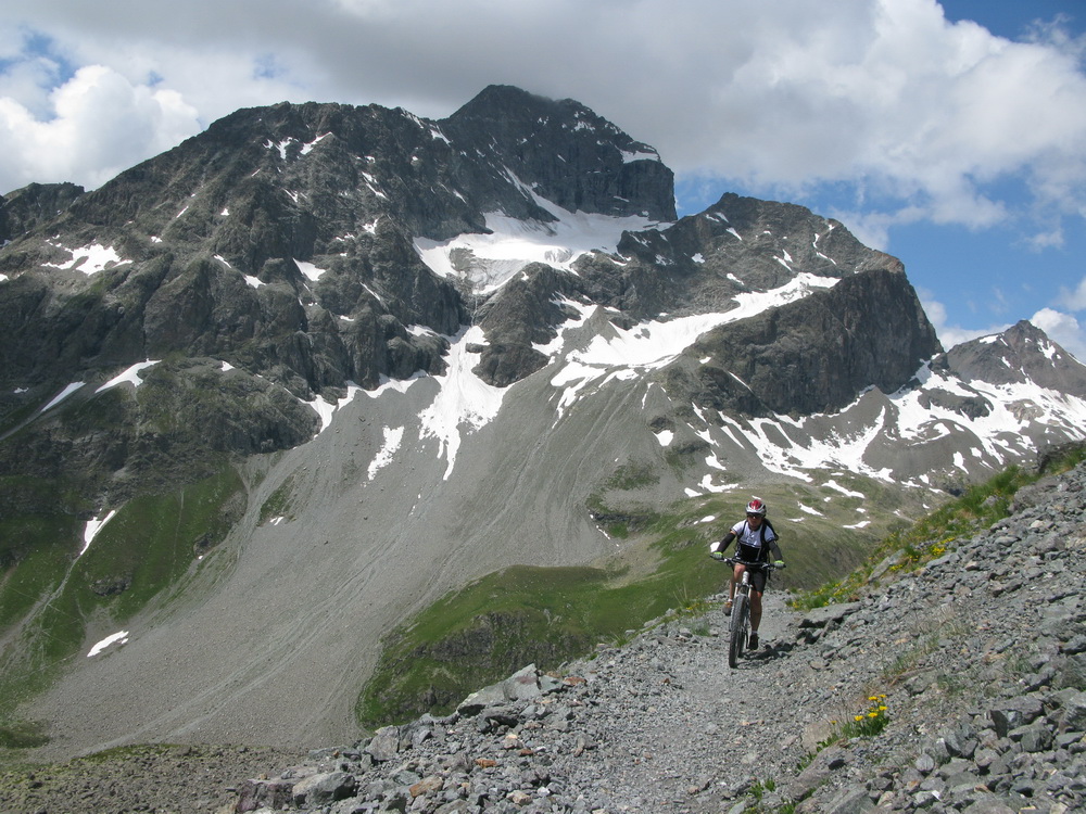 Mal som už nejaké informácie, podrobnú mapku singlov k tomu (je k dostaniu zdarma), a tak som si naplánoval a uskutočnil okruh cez Celerinu, serpentínami cez lyžiarske stredisko až k passo Suvretta. Zaujímavosťou bol už krásny traverz a zjazd do sedla. Tu sa už bajker dostáva pomaly mimo civilizáciu a umožní mu to práve krásny singlík, vytesaný miestami aj v žulovom suťovisku.