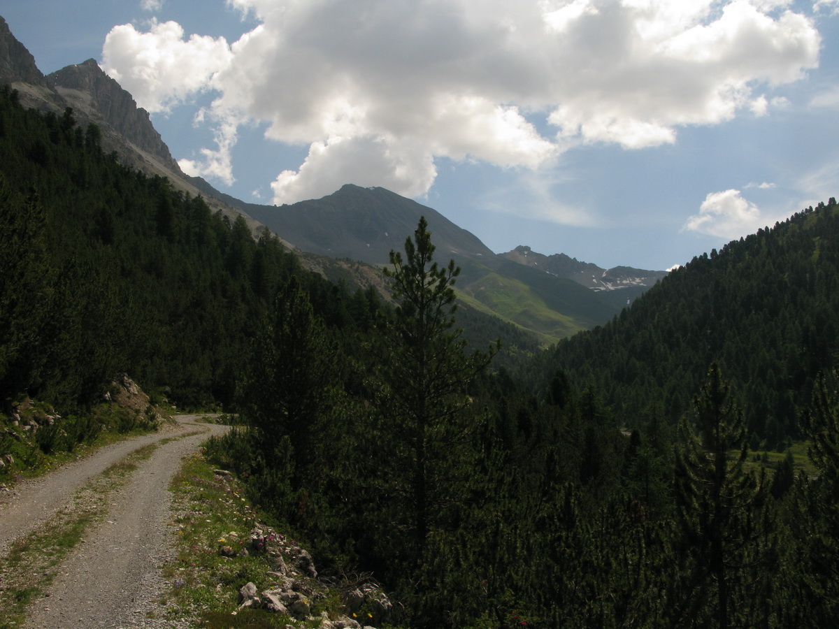 Zjazdujem dole Val Roseg. Ranné lúče už hrejú. Cez voľný deň v žiadnom prípade nehrozí skoré ranné vstávanie. Napájam sa na cyklotrasu, vedúcu údolím Engadin, a pohodlne sa po rovine približujem k môjmu cieľu: doline Chaschauna. Toto dlhé údolie, hraničiace so švajčiarskym národným parkom, by ma malo doviesť až na hrebeň, za ktorým sa už rozprestiera Talianske Livigno.