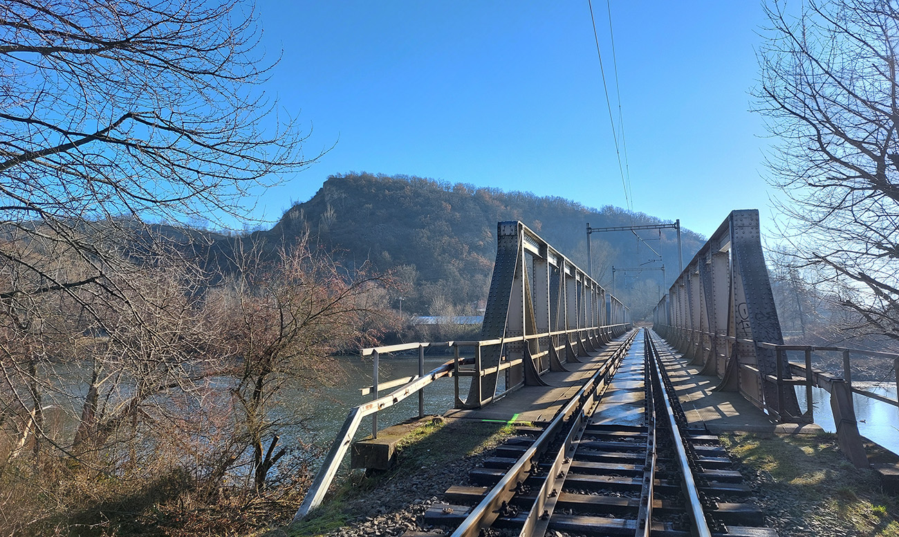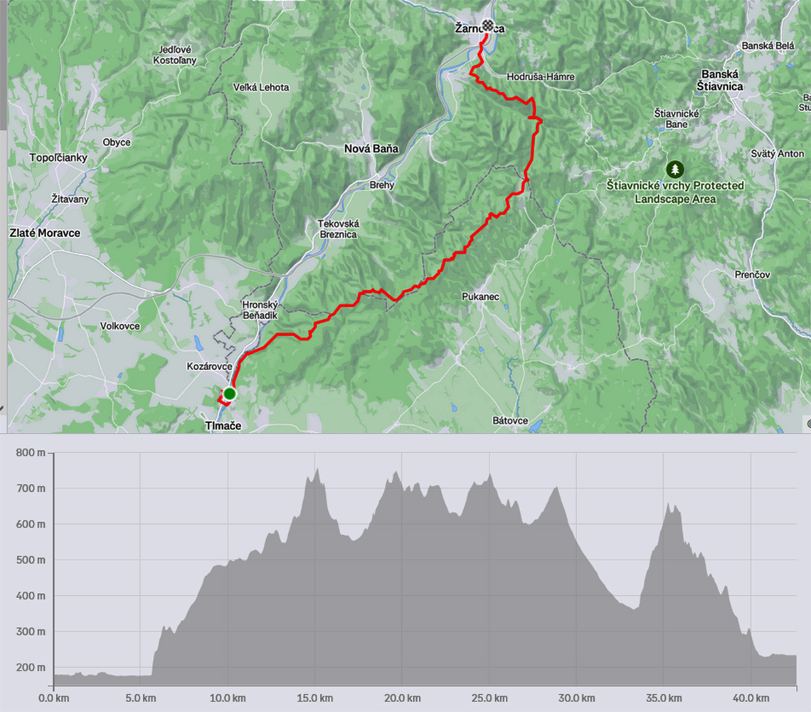 Na úvod improvizácia, lebo spoje z môjho smeru do Tlmáč slabé. Začal som v susedných Kozárovciach: zo železničnej stanice popod skalnú stenu starého lomu, potom trochu cezpoľného behu, cez železničný most na druhý breh Hrona a v ďalšom lome, ešte aktívnom, som sa napojil na tú modrú.