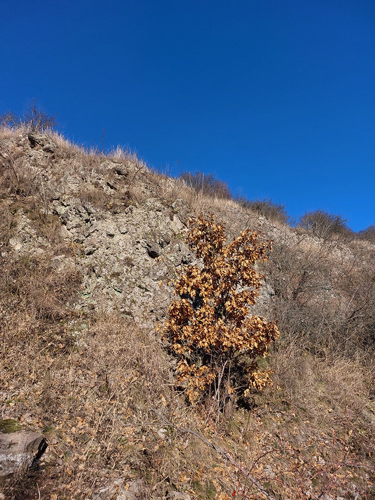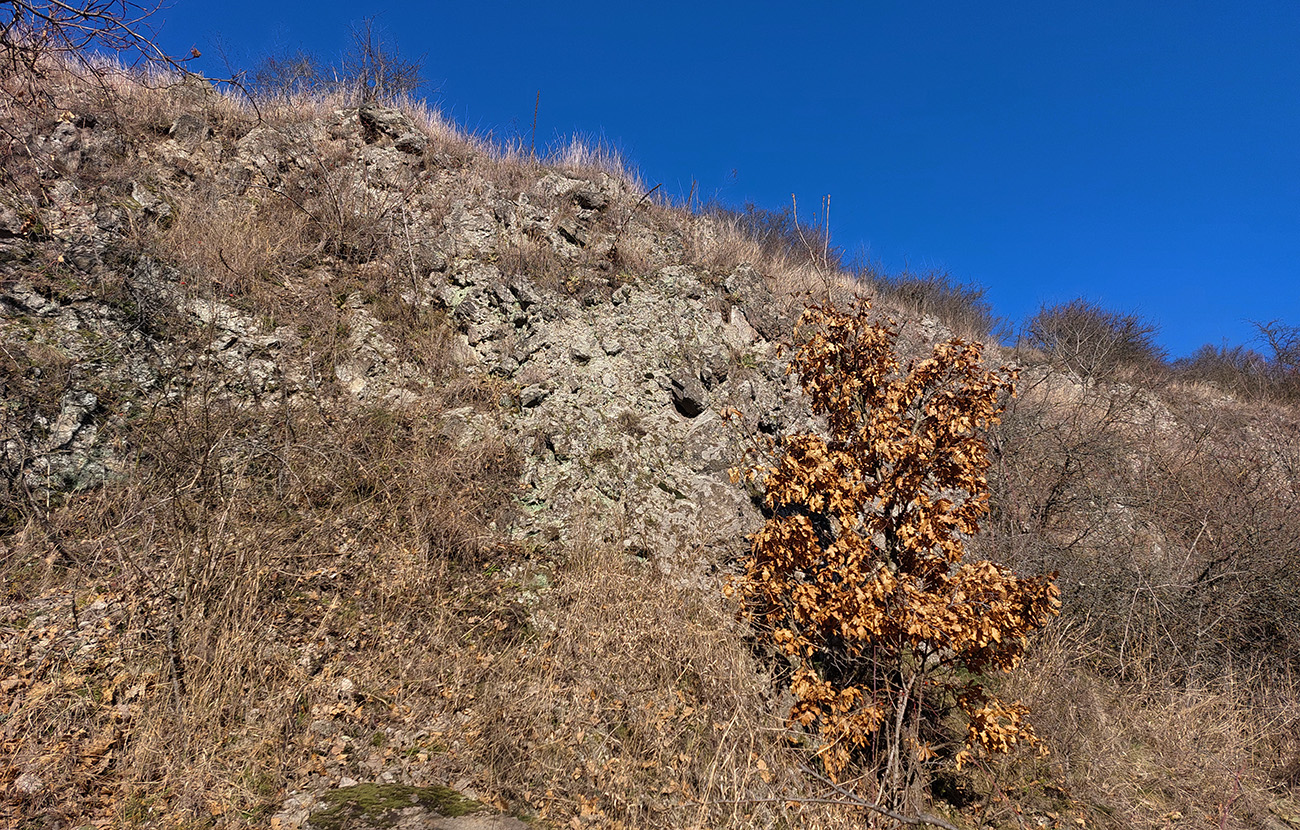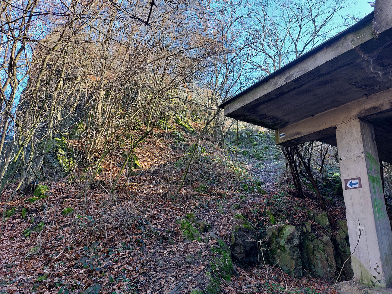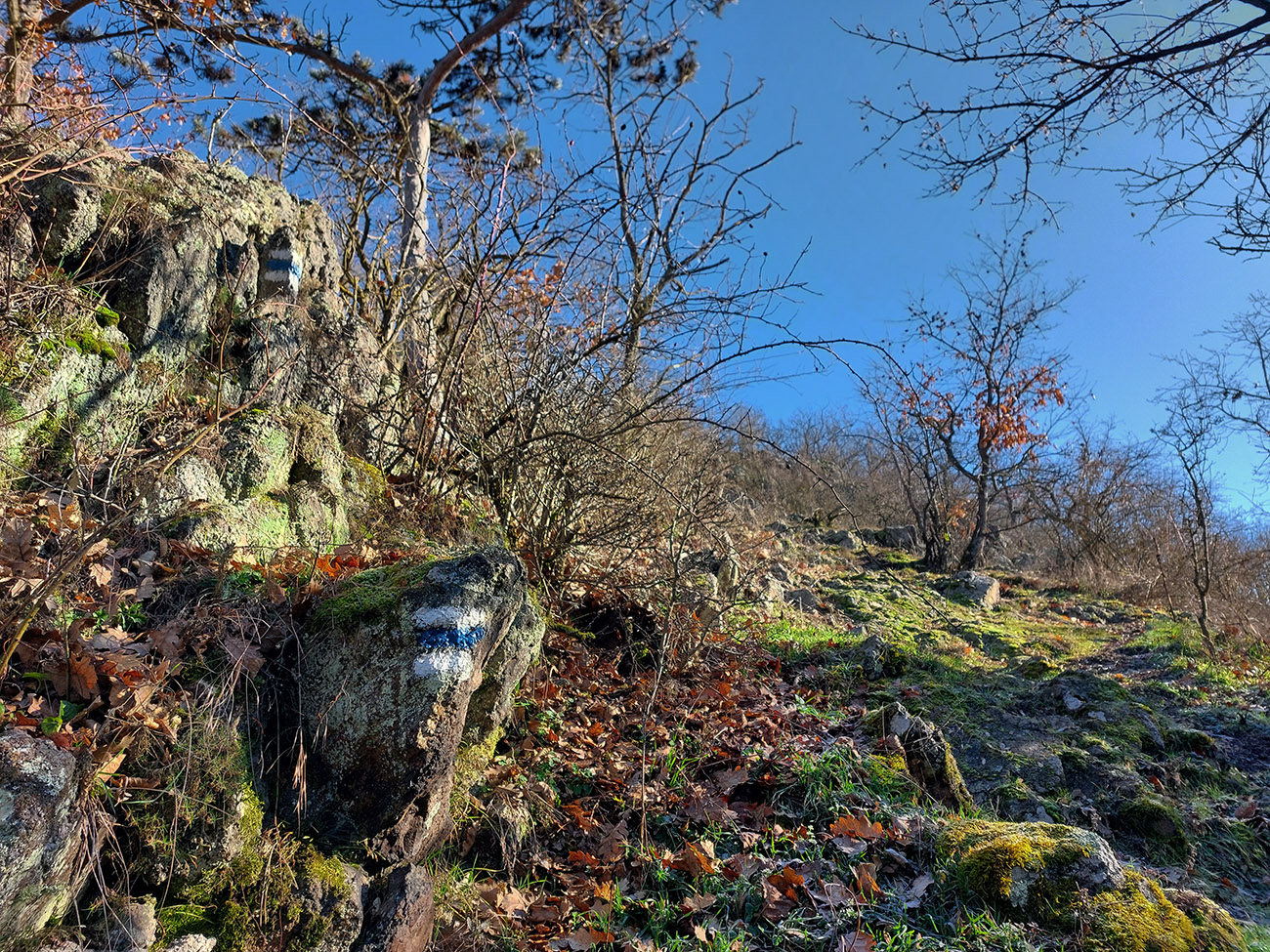Začiatok modrej je taký trochu divný, lebo podľa máp vedie priamo cez zariadenie toho kameňolomu, lenže aj tabuľky zákazu vstupu sú tam a značky žiadne. Ale dá sa to poobchádzať. Prečo tú značku už dávno nepreložili - ktovie? Nástup pomedzi vinohrady na východ od lomu by bol príjemnejší.
