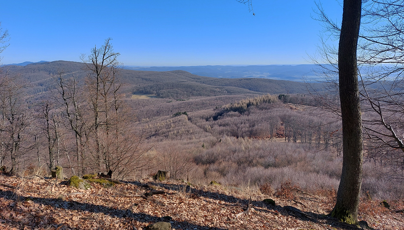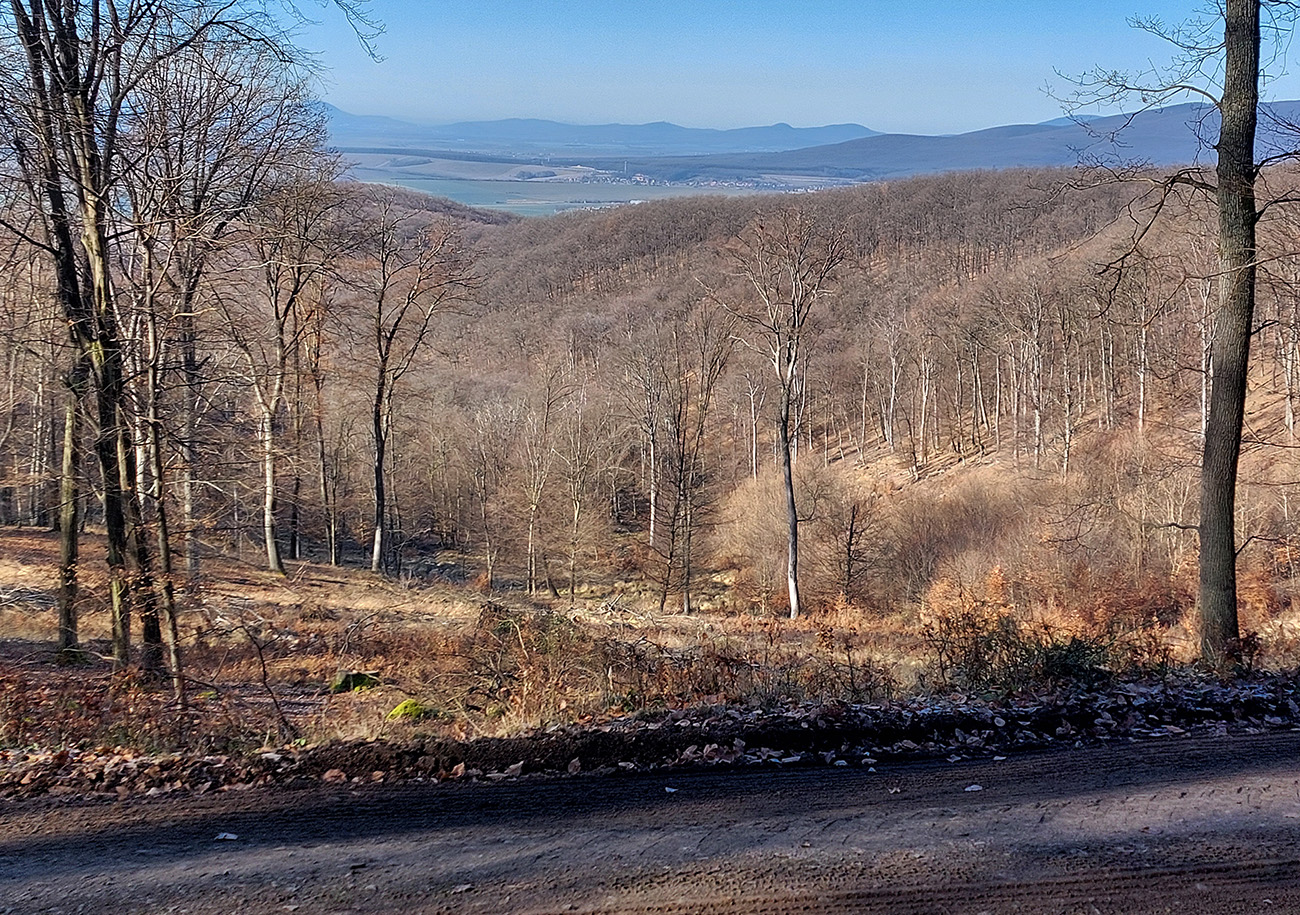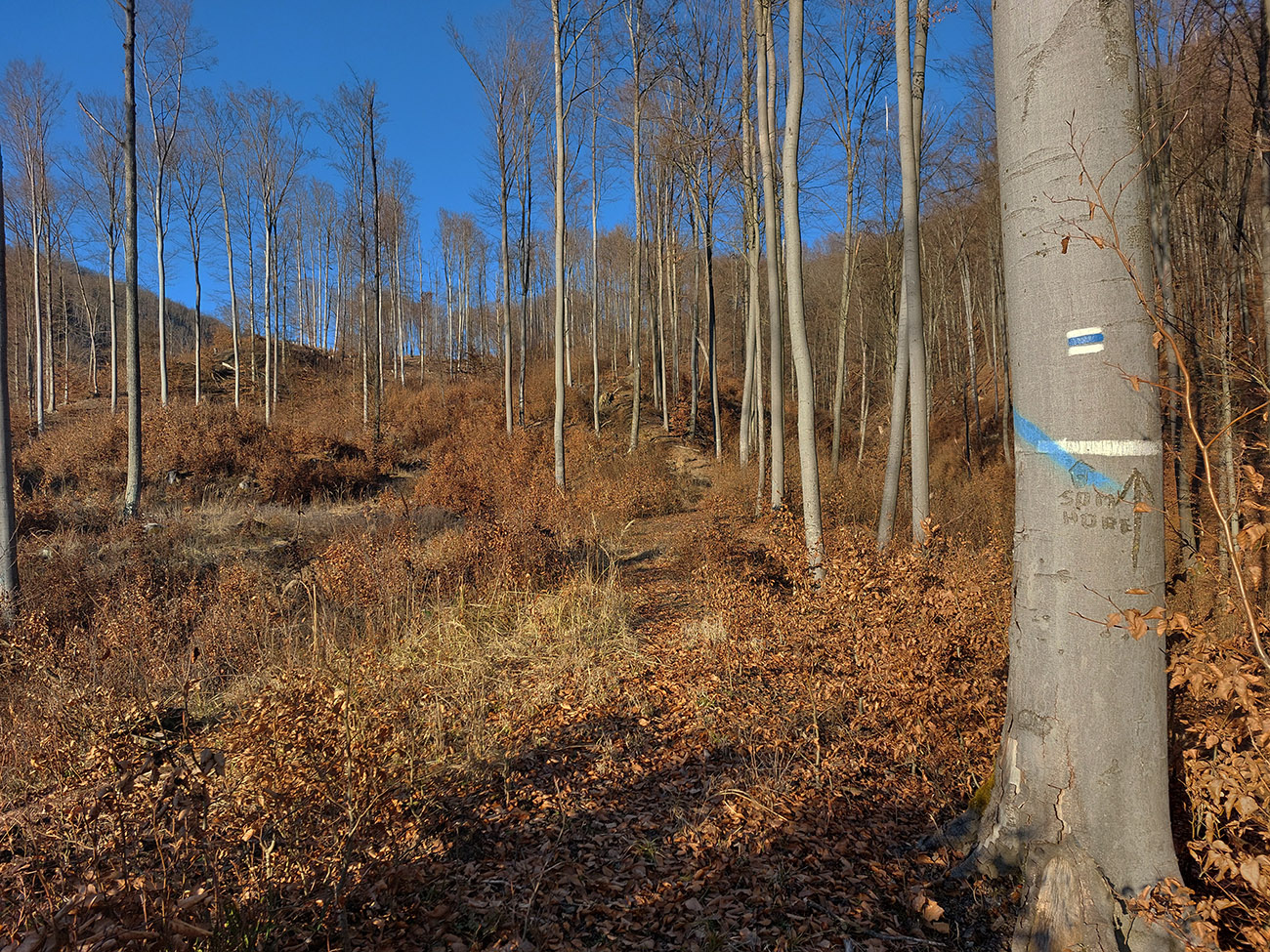 Nasleduje dlhý úsek, kde sa striedajú takmer neexistujúce, zato poriadne hrboľaté chodníky (našťastie značiek milión), s kratšími úľavami pre nohy na pevných lesných cestách. Len cez občasné rúbaniská nejaké tie výhľady, inak naokolo riedke, dospelé, listnaté hospodárske lesy. Kúsok potkýnania aj popri plote zvernice – majitelia asi nevedia, čo s prachmi, keď tam musia mať brány ako do milionárskej haciendy.