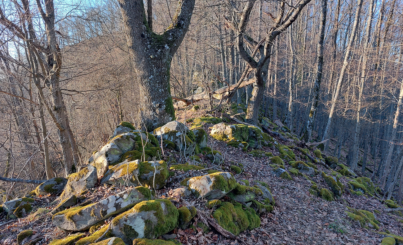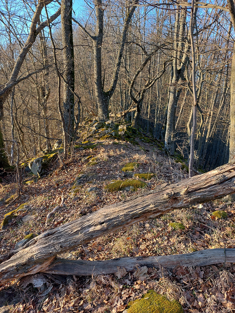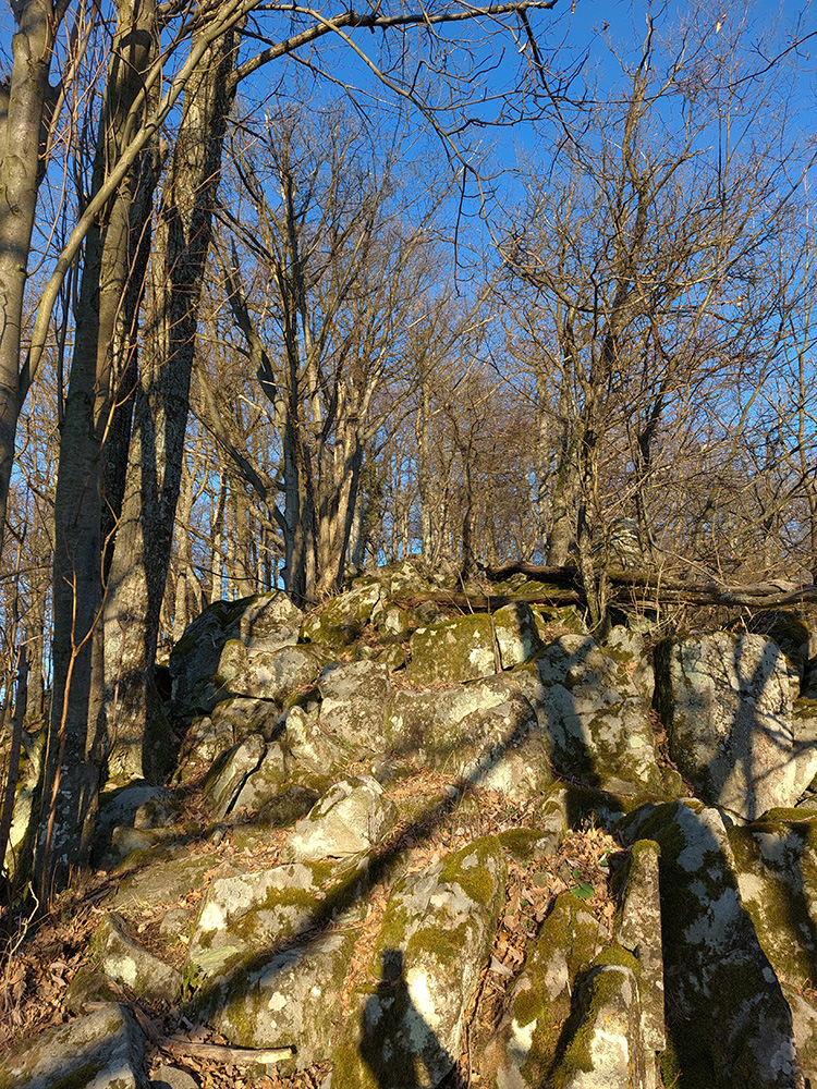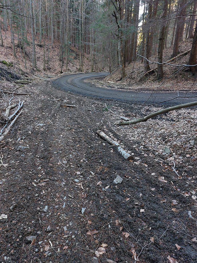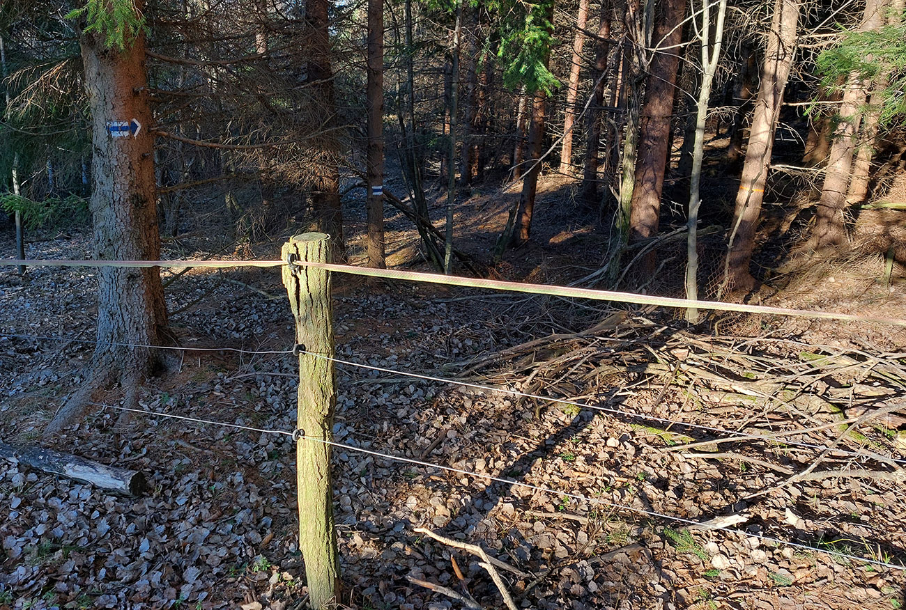 Nasleduje dlhý úsek, kde sa striedajú takmer neexistujúce, zato poriadne hrboľaté chodníky (našťastie značiek milión), s kratšími úľavami pre nohy na pevných lesných cestách. Len cez občasné rúbaniská nejaké tie výhľady, inak naokolo riedke, dospelé, listnaté hospodárske lesy. Kúsok potkýnania aj popri plote zvernice – majitelia asi nevedia, čo s prachmi, keď tam musia mať brány ako do milionárskej haciendy.