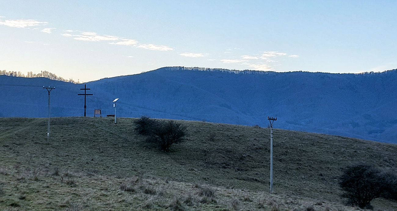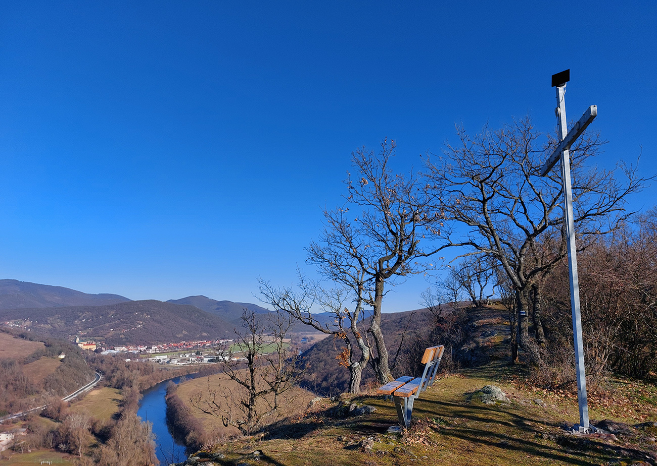 Výška sa začína poriadne strácať až ku koncu. To už sa otvárajú pohľady na cieľovú Žarnovicu vpravo vpredu – no stále je nejako ďaleko a hlboko. Úplný záver vedie cez lúky popri kríži, ktorý bol postavený pri výročí 900 rokov prvej zmienky o Voznici. Značka potom klesá ku Hronu - logicky k areálu, kde ústi známa Voznická dedičná štôlňa. Lenže tam sa človek bez povolenia nedostane a do mesta je to ešte ďaleko a po ceste bez krajnice. Dá sa však švihnúť pred krížom doprava a krížom cez pasienky sa na asfalt napojiť tesne pred mostom cez Hron. Takže improvizácia aj na záver, ale jednoduchá.