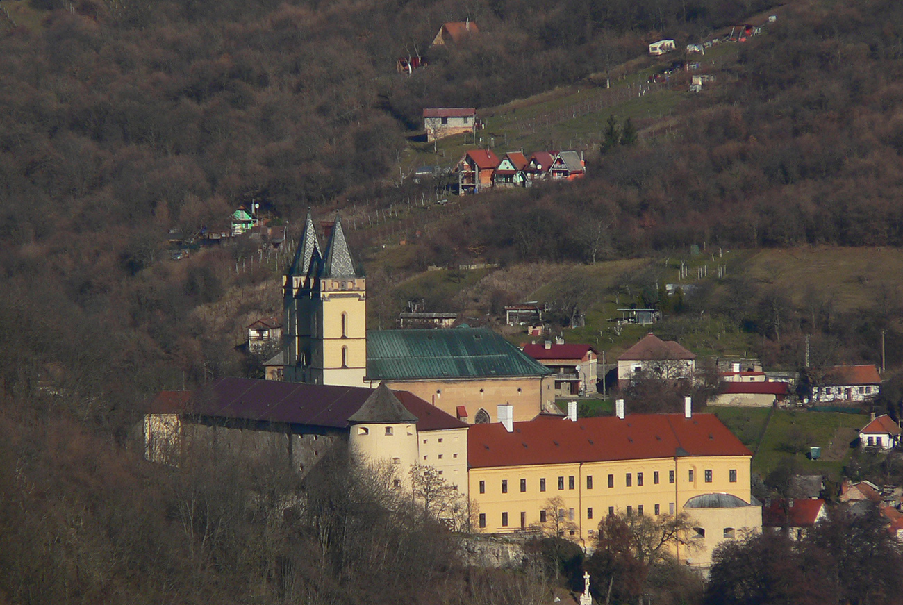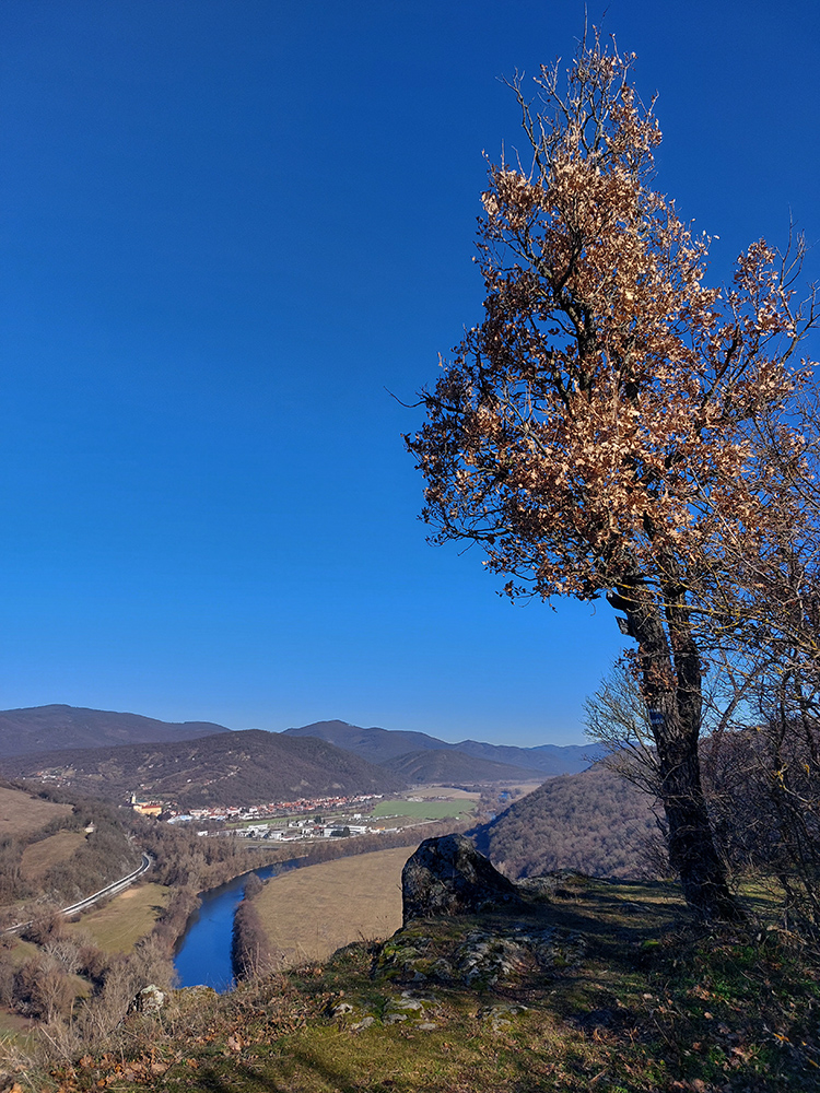 Cestou ku krížu a lavičke na vrchole Krivína je pár podobných vyhliadok z okraja skál, len v detailoch sa tie panorámy líšia. V tej poslednej pekne svieti aj kláštor v Beňadiku, ktorý celý konečne vylezie spoza rohu: